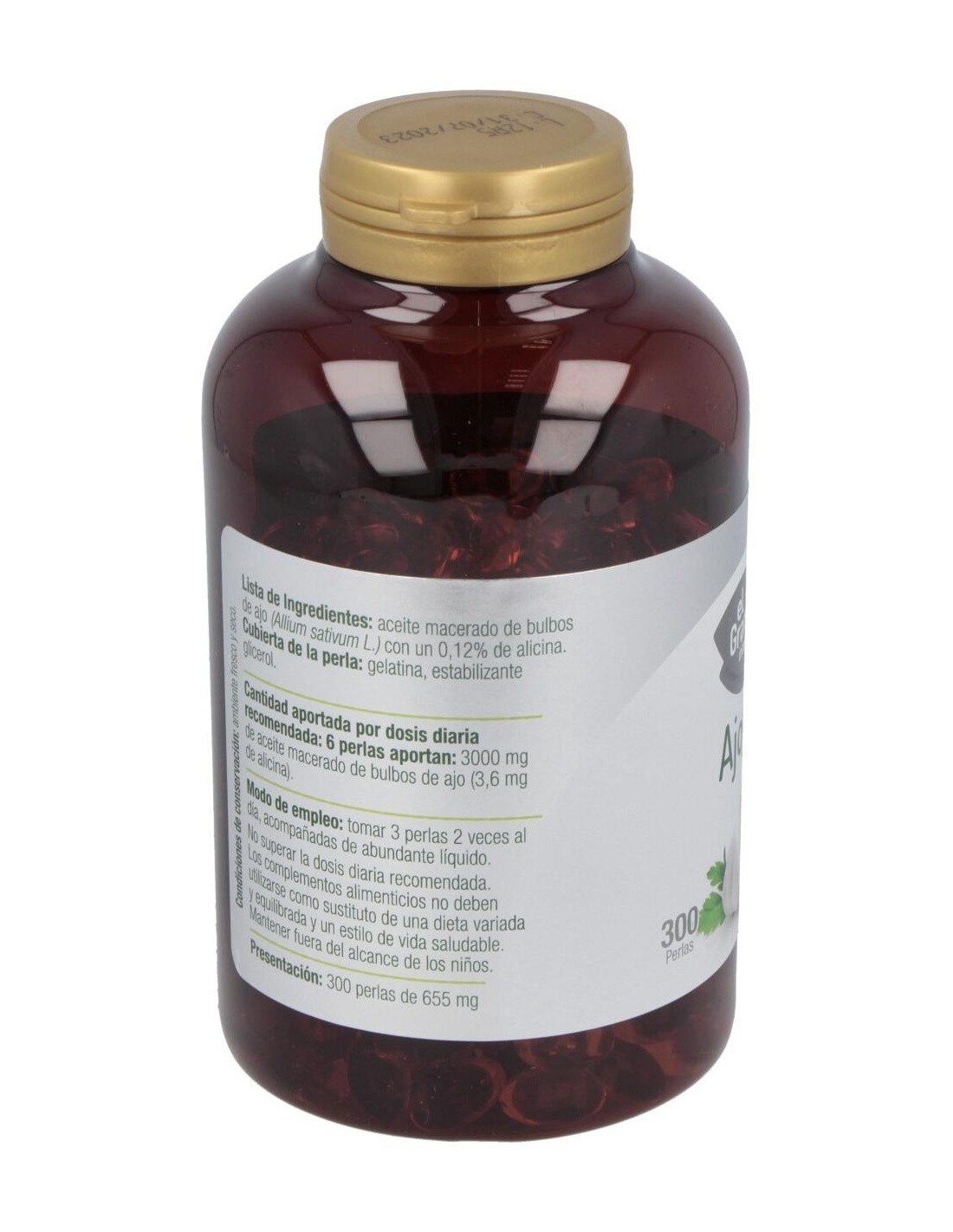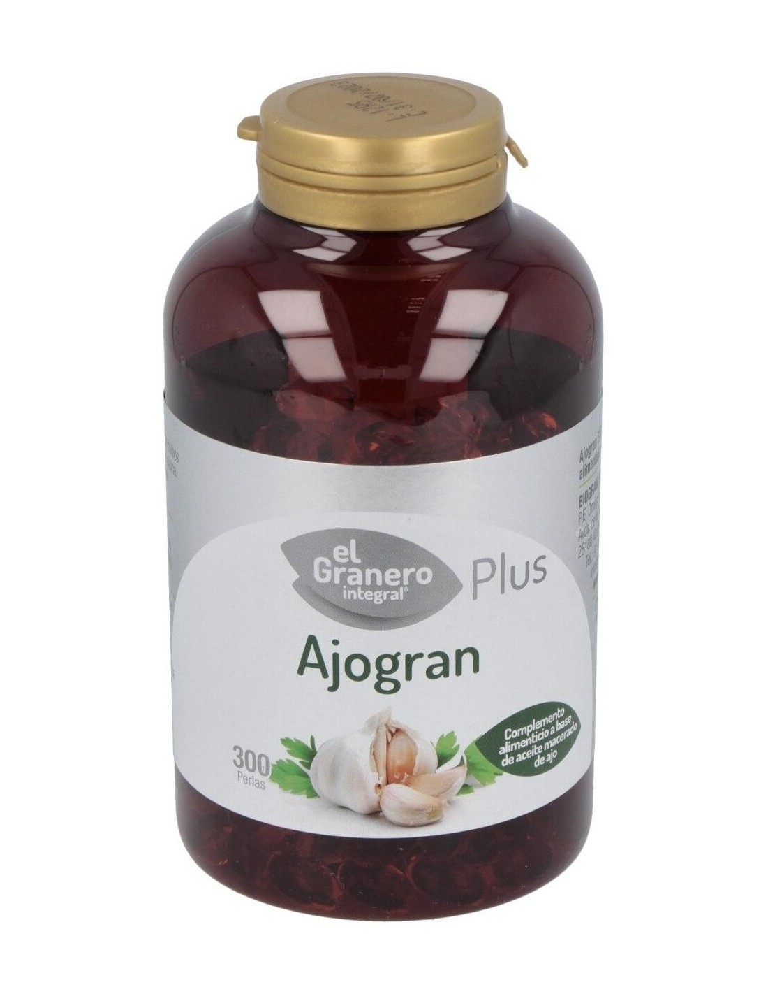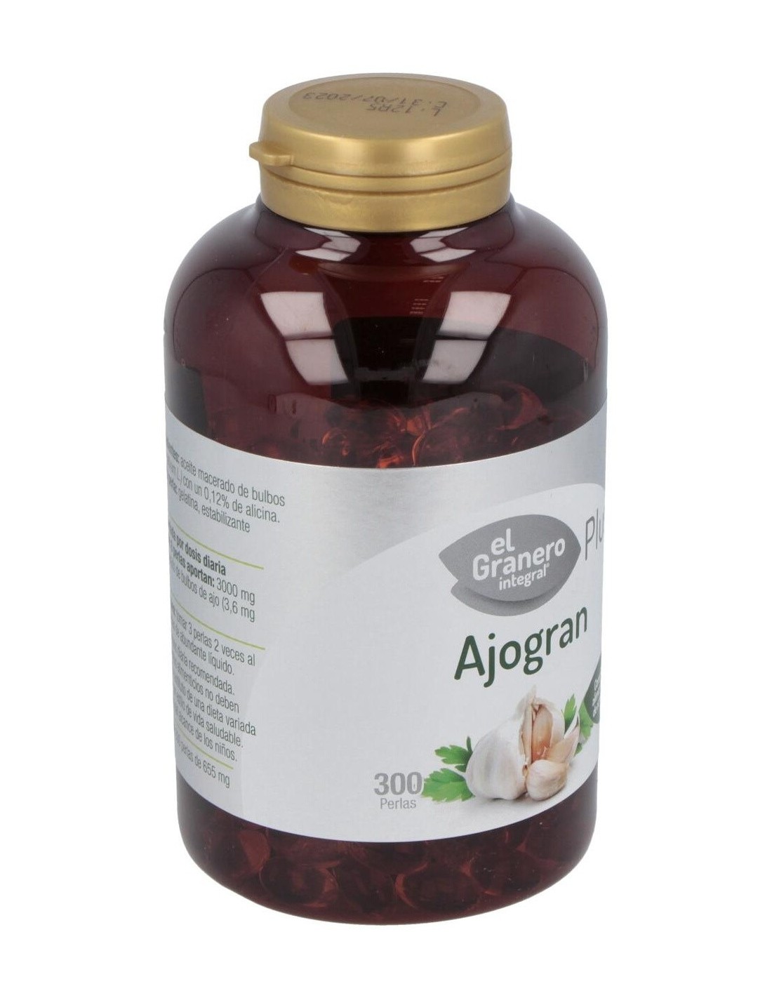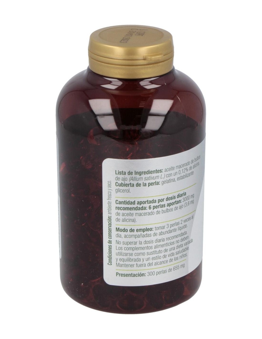Complemento alimenticio formulado a base de aceite macerado de bulbos de ajo. Envase de 300 perlas.