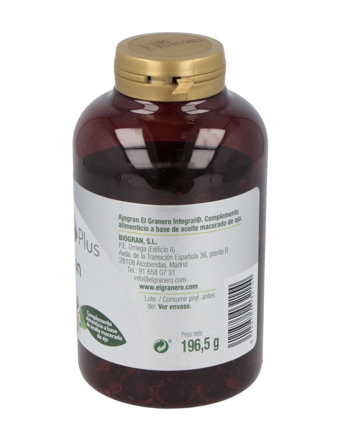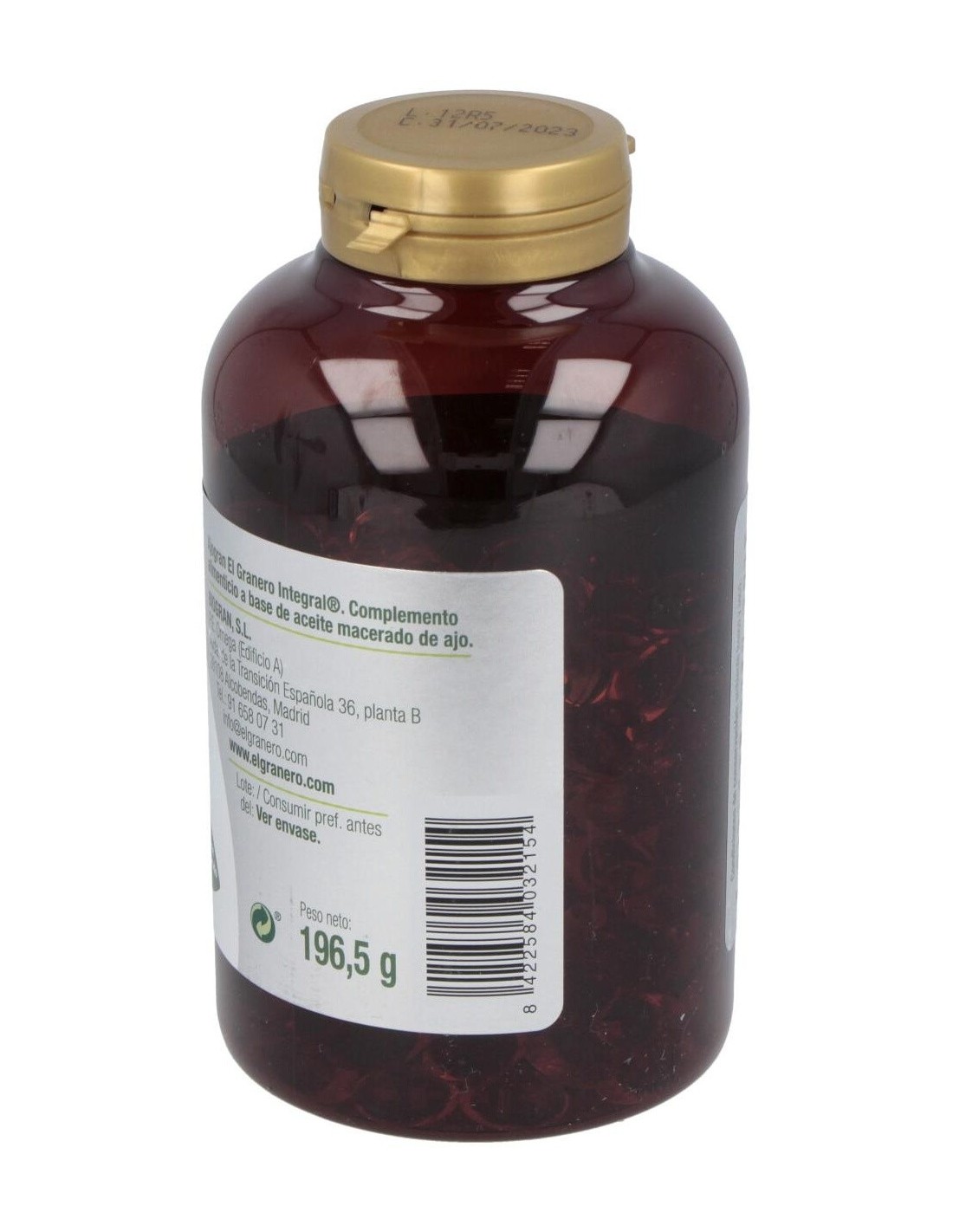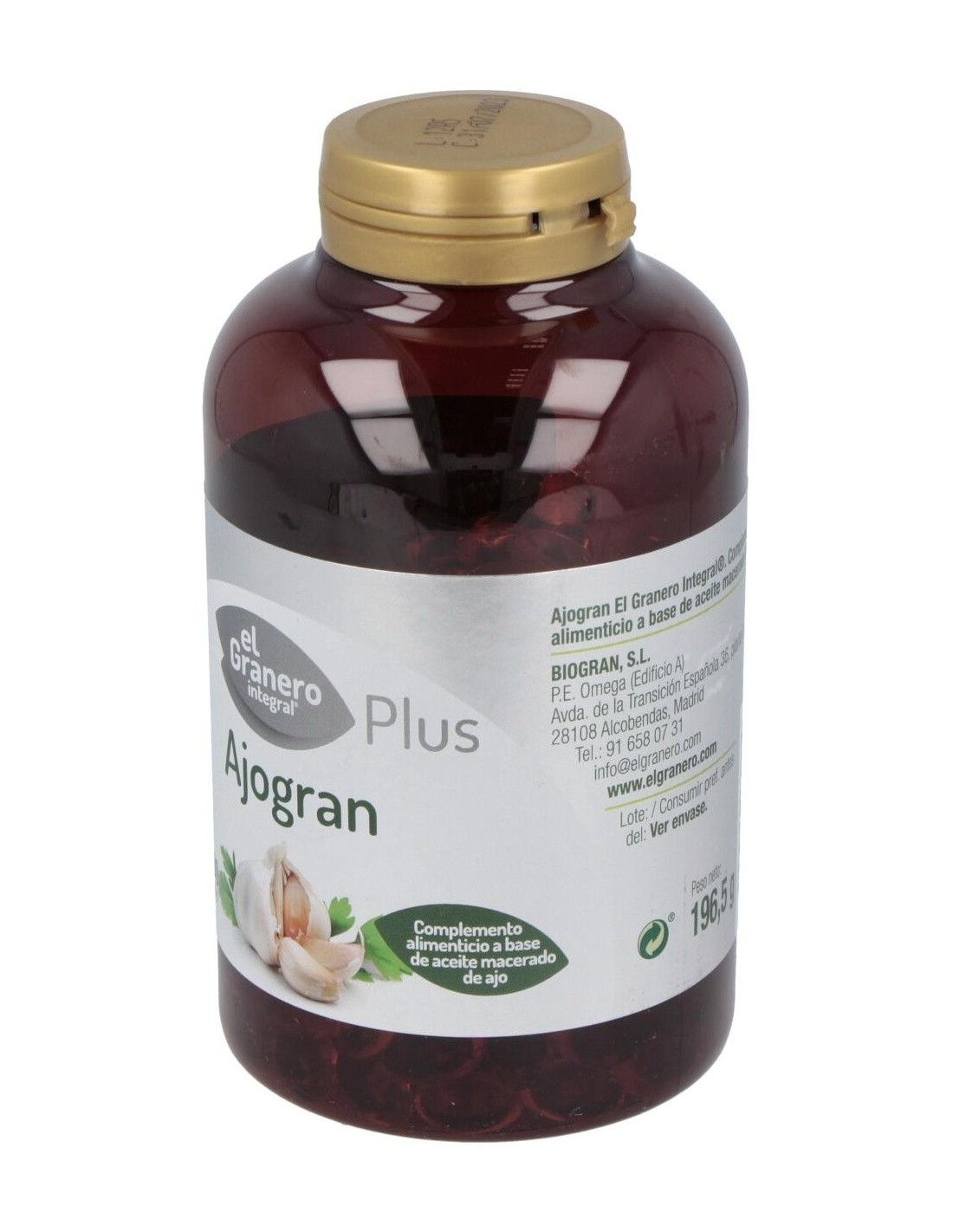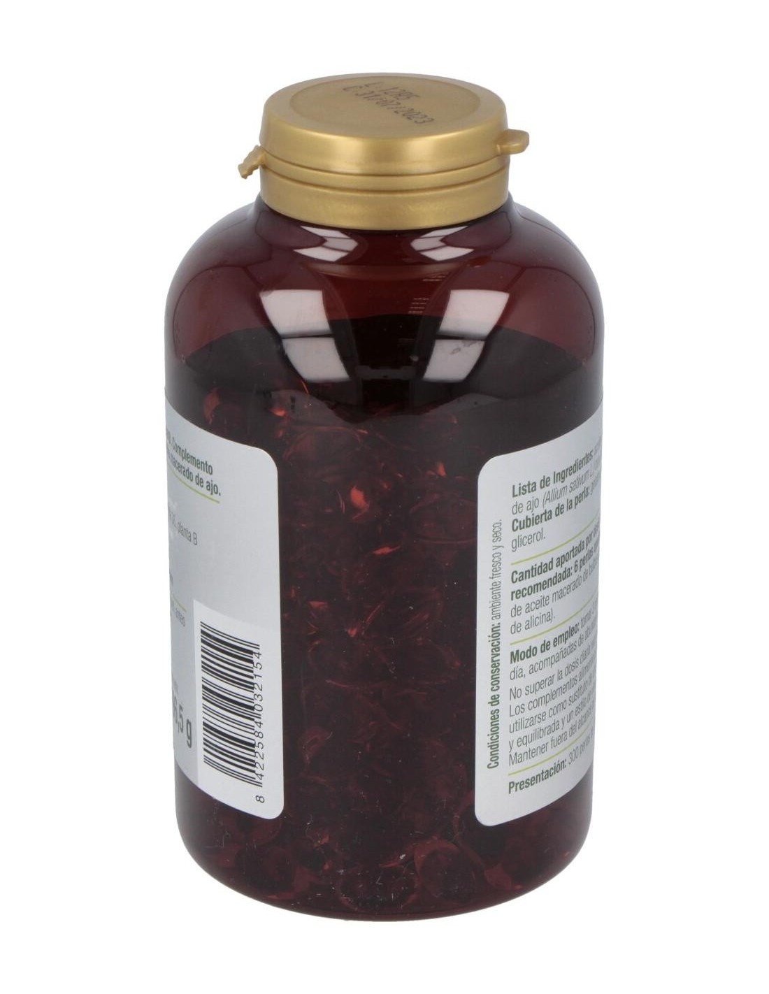 Complemento alimenticio formulado a base de aceite macerado de bulbos de ajo. Envase de 300 perlas.