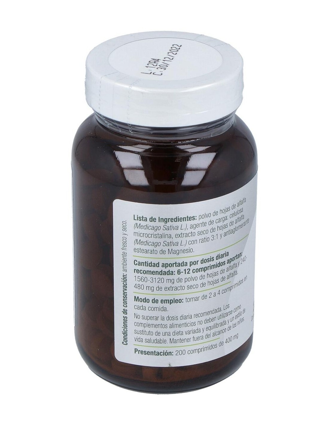 Polvo de hojas de alfalfa (Medicago Sativa L.), agente de carga: celulosa microcristalina, extracto seco de hojas de alfalfa (Medicago Sativa L.) con ratio 3:1 y antiaglomerante: estearato de Magnesio y dióxido de Silicio.