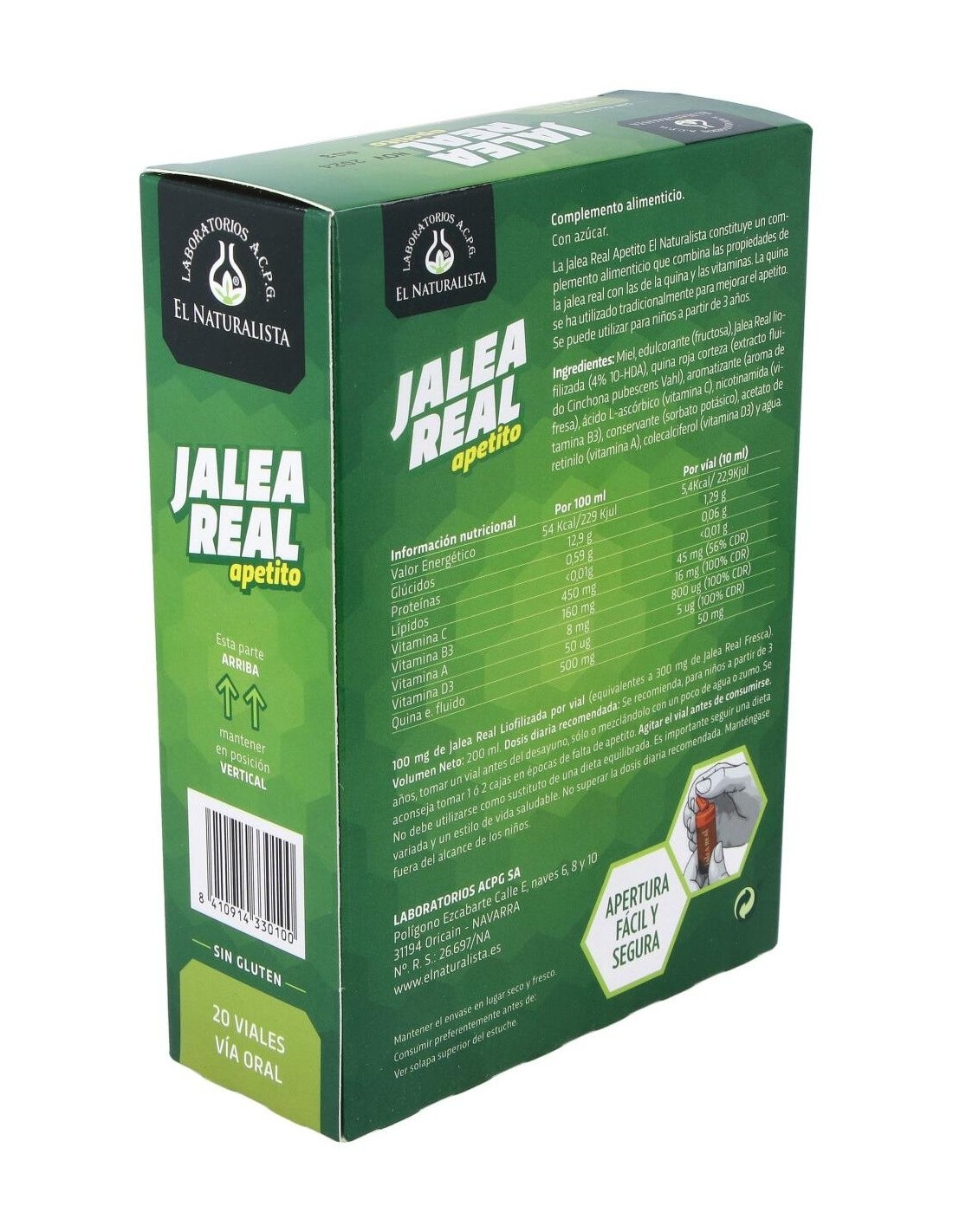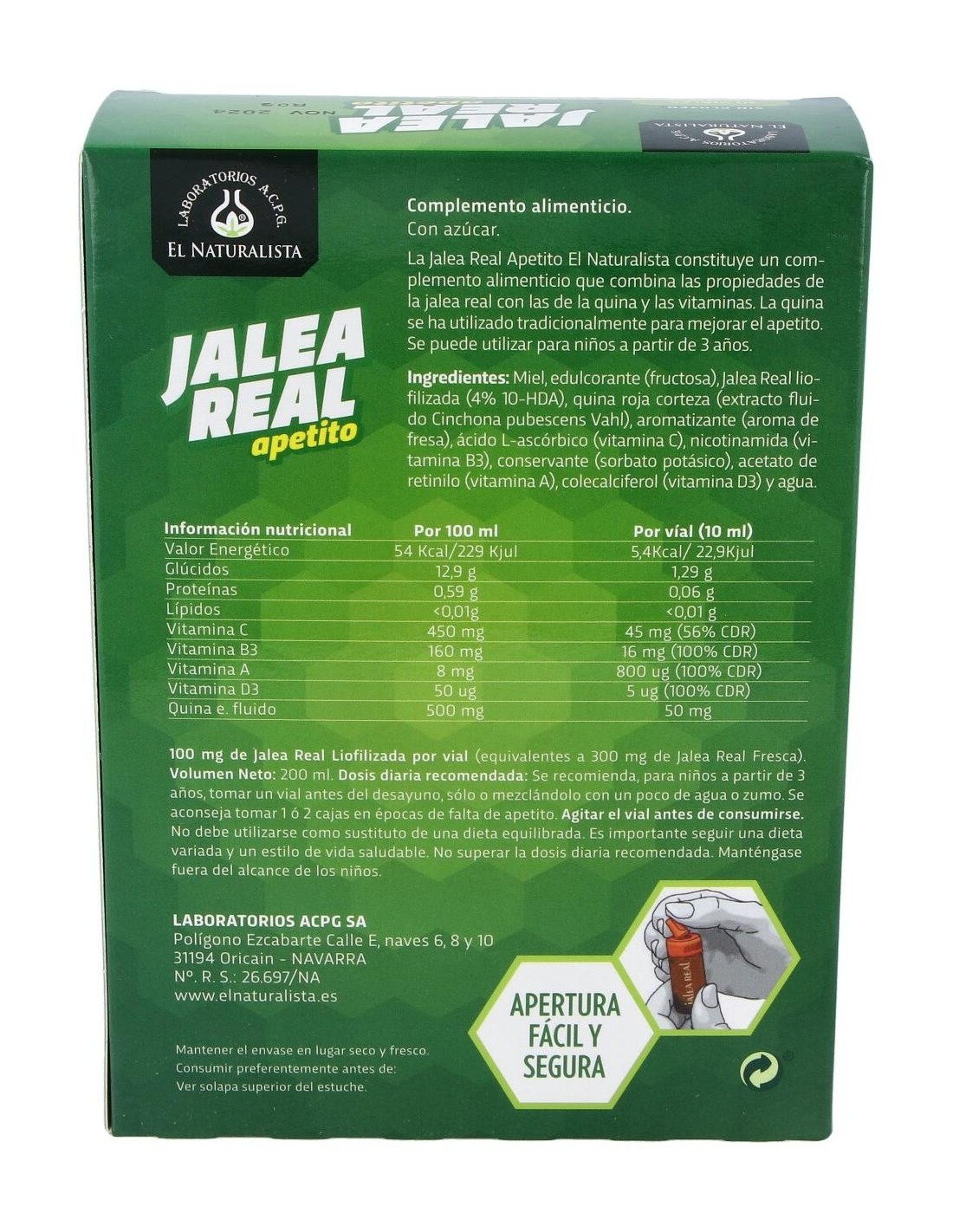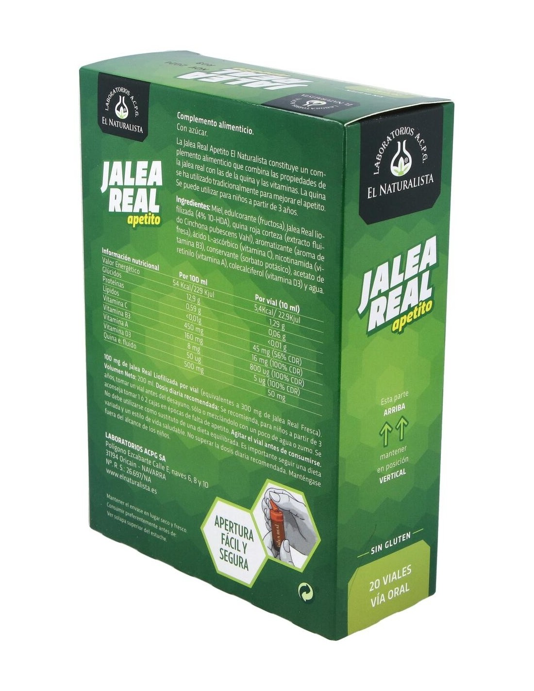 El Naturalista Jalea apetito con quina 20 viales es un complemento alimenticio con jalea real presentado en viales que ofrece al organismo las vitaminas, los minerales y la energía necesaria para afrontar el día a día.