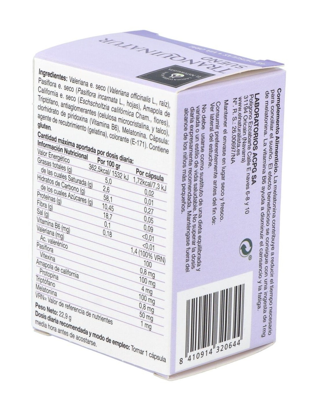 100 mg de E. seco valeriana 0,8% valerénico, 100 mg de E. seco pasiflora 4% vitexina, 100 mg de E. seco Amapola de California 0,8% alcaloides (protopina), 50 mg de Triptófano, 1 mg de Melatonina, 1,4 mg de Vitamina B6 y csp de Excipientes (talco, celulosa microcristalina y gelatina (cápsula)).