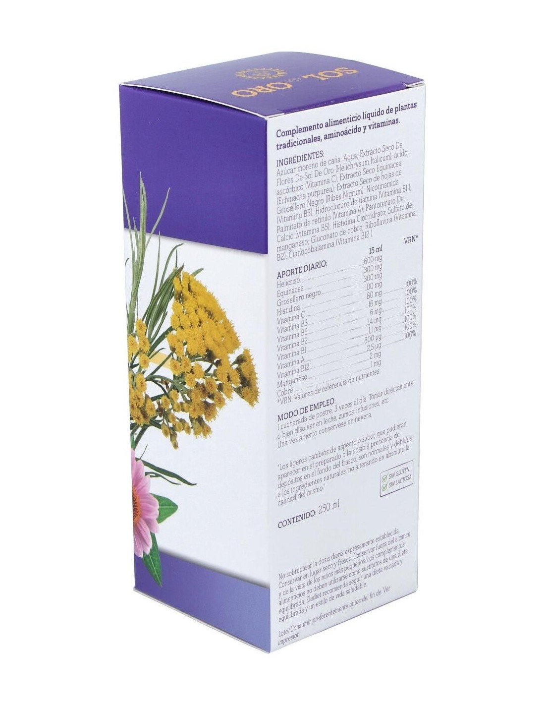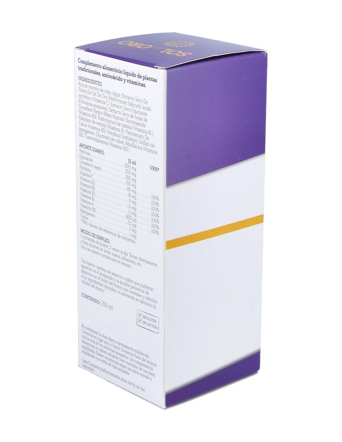 Sol de Oro Plus es un complemento alimenticio líquido que favorece una correcta respuesta del organismo frente a condiciones ambientales adversas como el polen, los ácaros o el polvo.