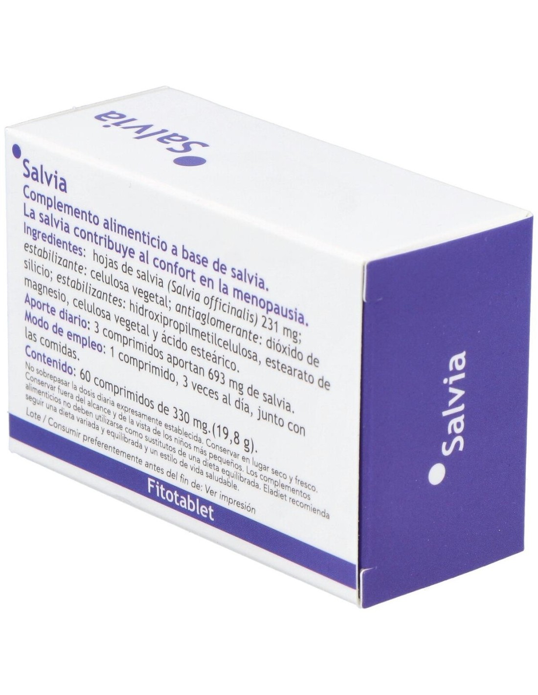 Fitotablet salvia es un complemento alimenticio indicado especialmente a mejorar los síntomas del climaterio. Su principal ingrediente, la salvia, posee propiedades que reducen los dolores mestruales y facilitan el vaciado eliminado los dolores de cabeza, irritabilidad, retención de líquidos o dolores de estómago.