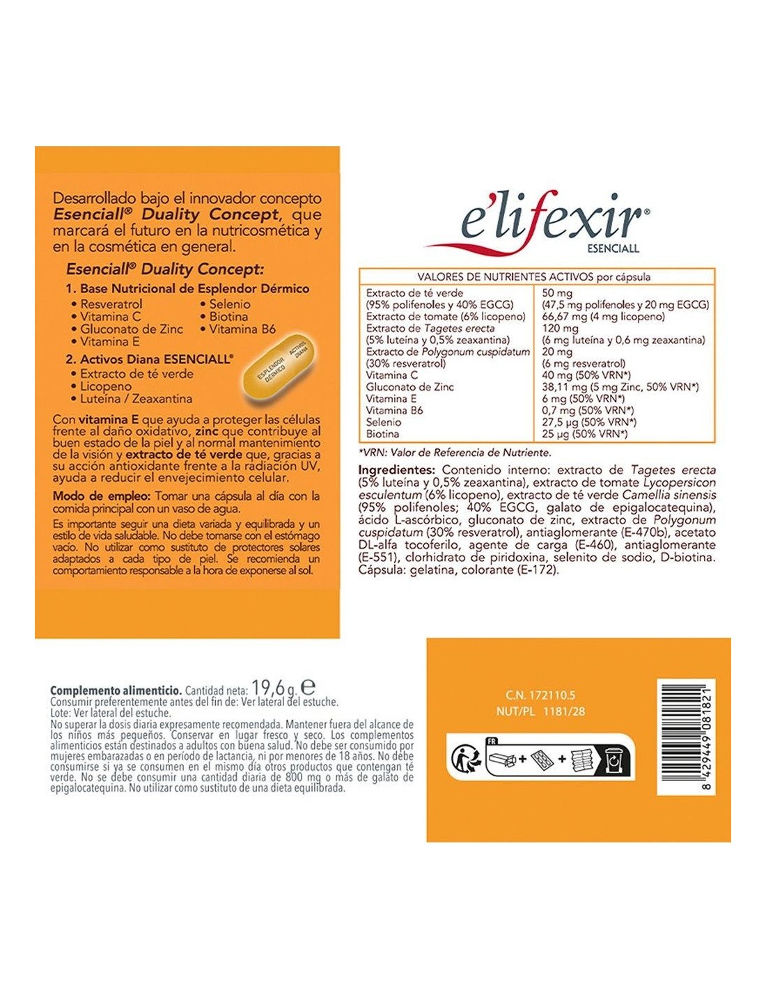 Extracto de Tagetes erecta (5% luteína y 0,5% zeaxantina), extracto de tomate (6% licopeno), extracto de té verde (95% polifenoles: 40% EGCG, galato de epigalocatequina), ácido L-ascórbico, gluconato de zinc, extracto de Polygonum cuspidatum (30% resveratrol), antiaglomerante (E-470b), acetato DL-alfa-tocoferilo, agente de carga (E-460), estabilizante (E-551), clorhidrato de piridoxina, selenito de sodio, D- biotina. Cápsula: gelatina, colorantes (E-171, E-172).