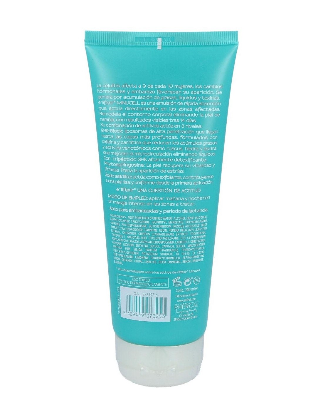 E'lifexir Minucell gel anticelulítico 200ml es un tratamiento de rápida absorción y textura fresca que favorece la eliminación de las acumulaciones de grasa corporal, además de mejorar la textura de la piel de forma visible.