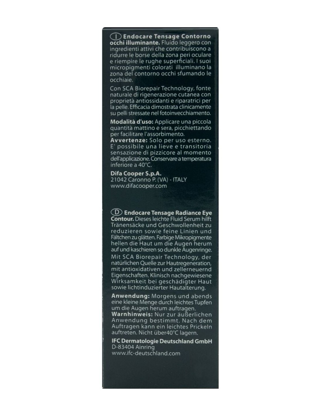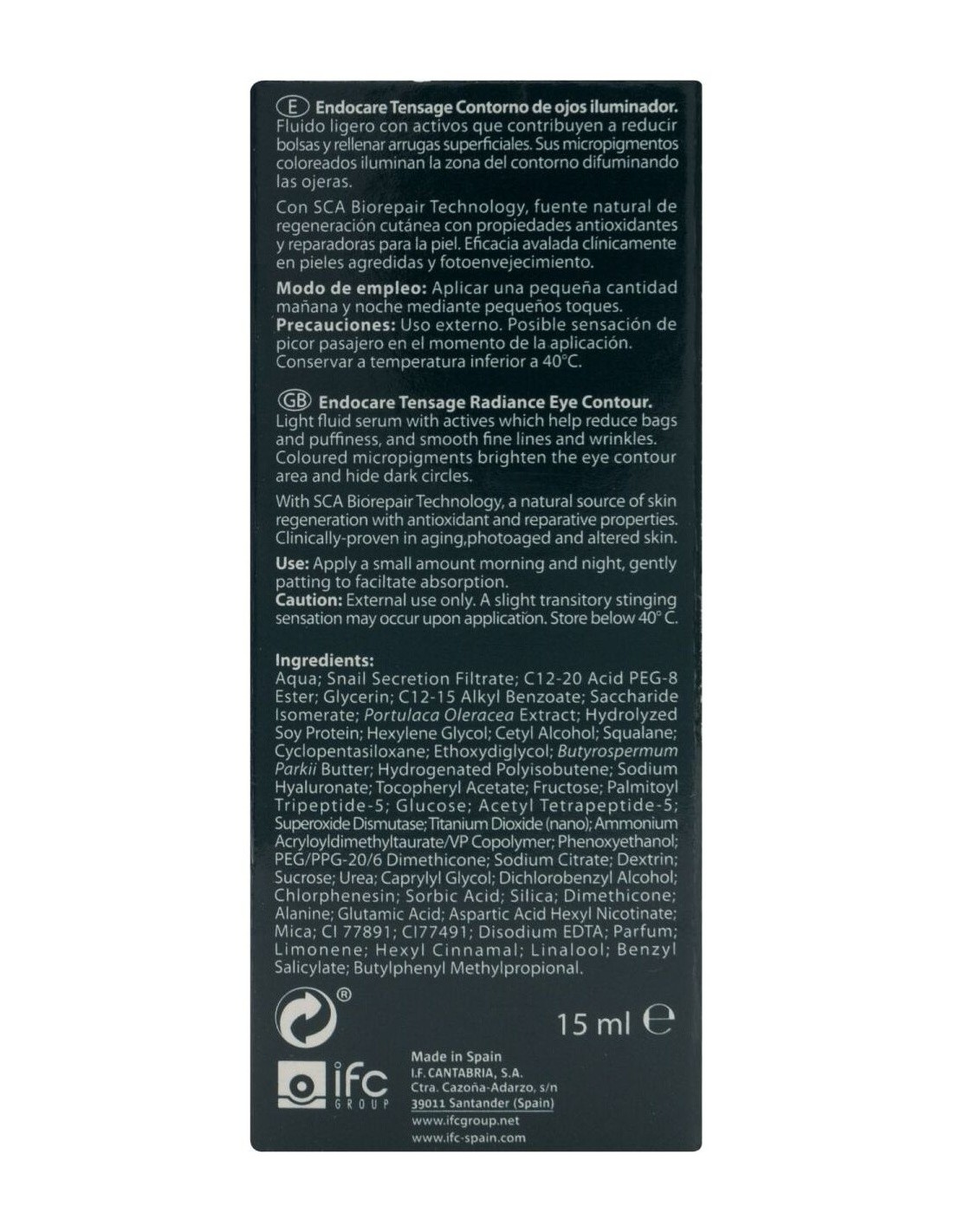 Endocare tensage contorno de ojos iluminador 15ml es un contorno de ojos de textura fluida y de fácil absorción. Su efecto regenerador y antiarrugas, junto con sus propiedades tensoras y antioxidantes, ayuda a reducir las bolsas y ojeras mientras se rellenan las imperfecciones superficiales.