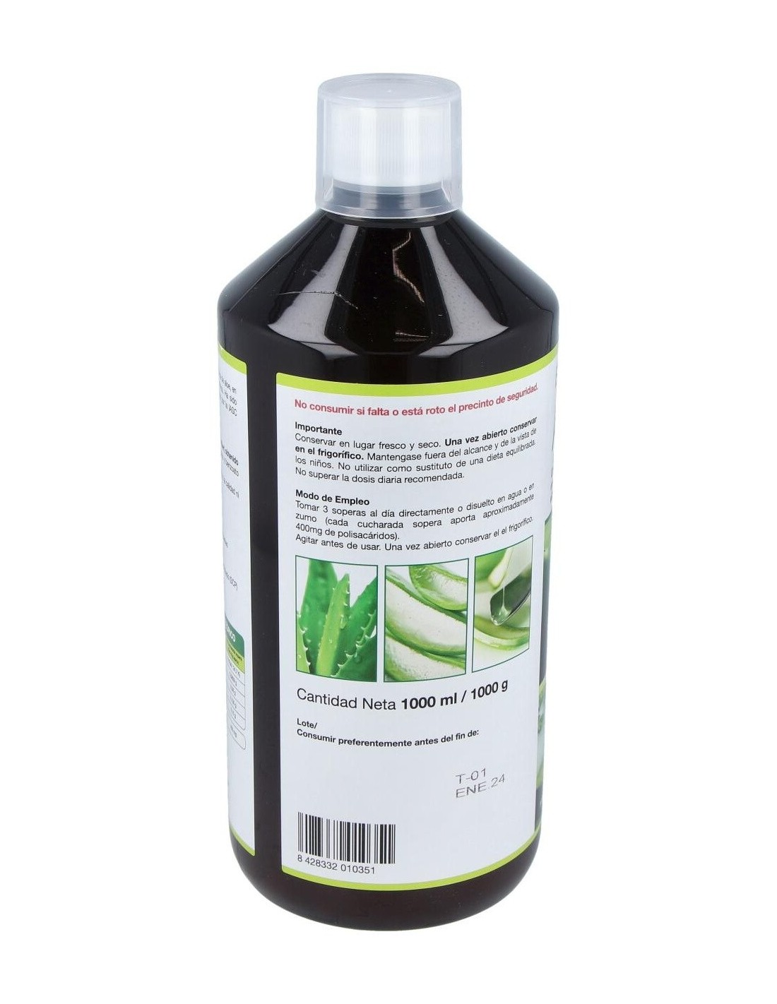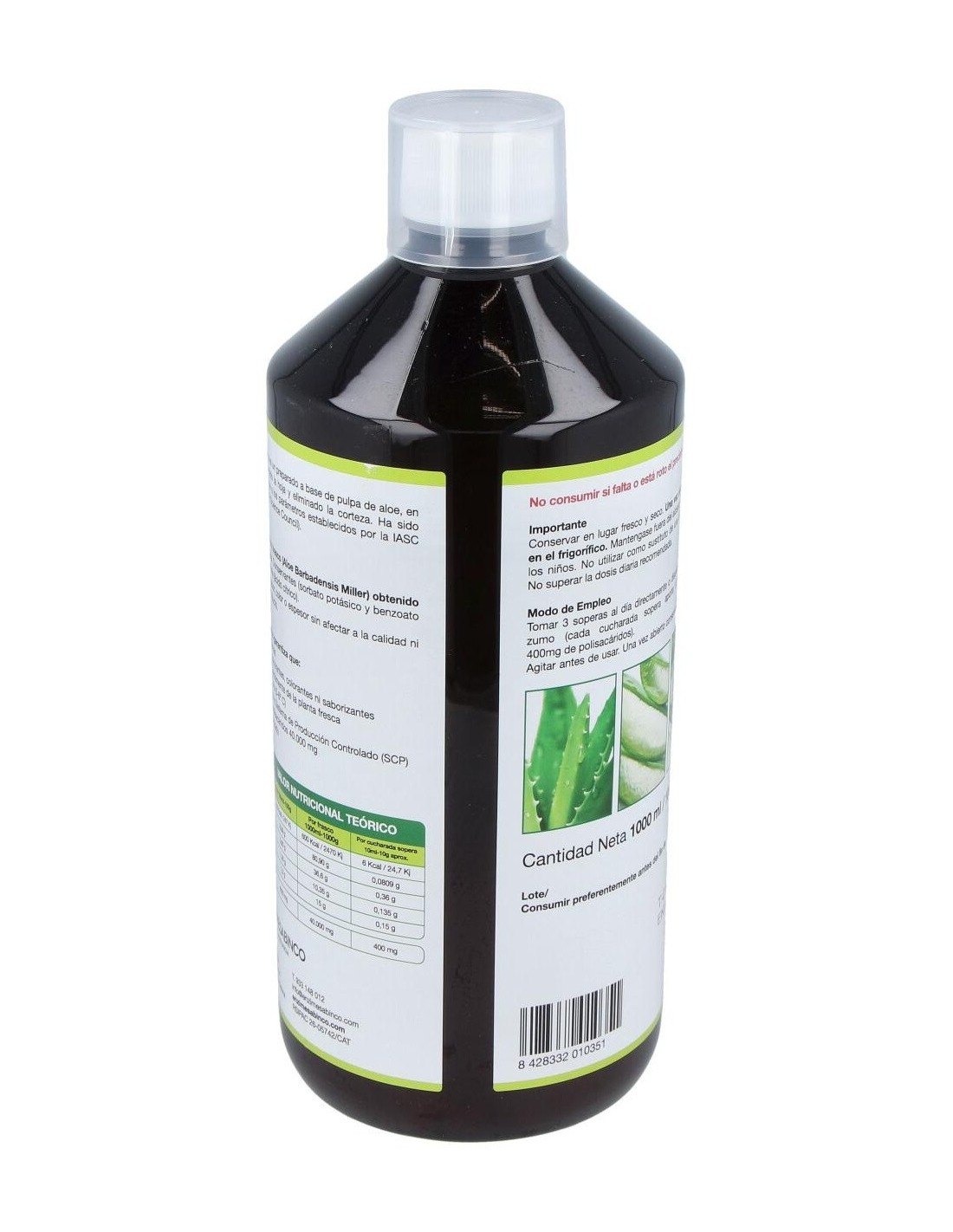 Jugo de aloe vera 100% obtenido de hojas procedentes de agricultura ecológica. Tiene propiedades depurativas, digestivas y diuréticas, es un coadyuvante en tratamientos de pérdida de peso. Aporta al organismo polisacáridos, vitaminas A, B1, B2, B6 y C, minerales como yodo, cobre, hierro, zinc, fósforo, azufre, manganeso, magnesio y calcio. Contiene aminoácidos esenciales para la salud del cuerpo.