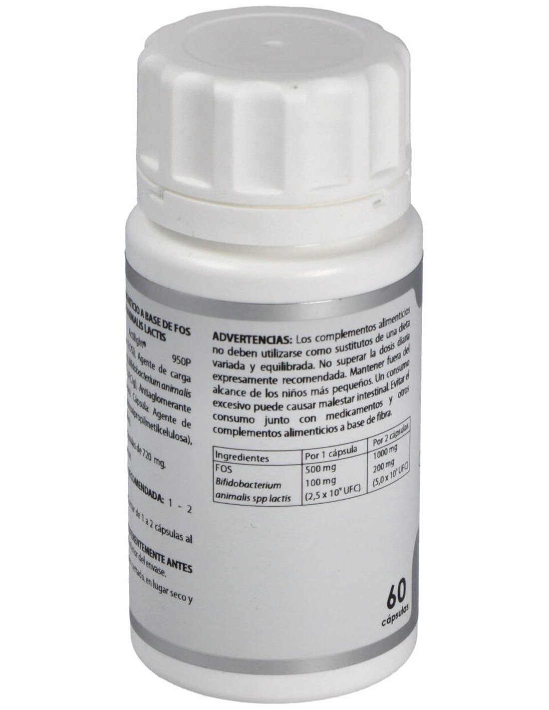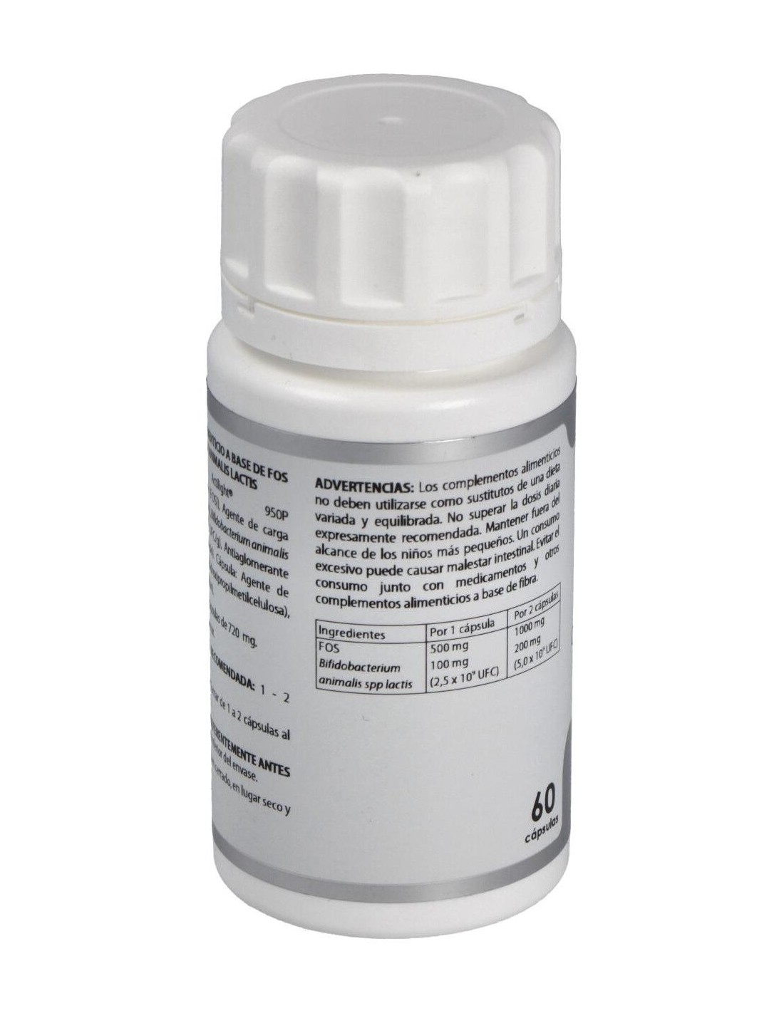 Actilight® 950P (Fructo-oligosacáridos (FOS)), 500 mg: Bifidobacterium animalis spp lactis (maltodextrina de maíz (agente de carga), Bifidobacterium animalis spp lactis LMG 18314) 2,5x1010 UFC/g, 100 mg. Excipiente tecnológico: estearato de magnesio (antiaglomerante), c.s. Envoltura: agente de recubrimiento (hidroxipropilmetilcelulosa) y gelificante (goma gellan)