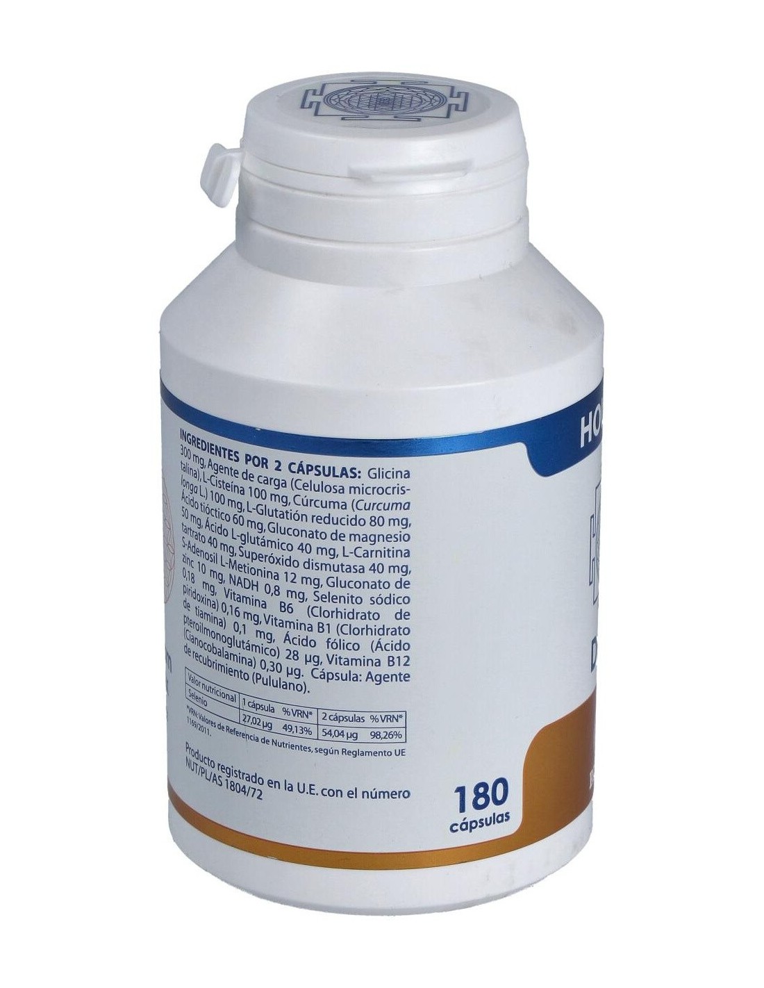 GLICINA, L-CISTEÍNA, CÚRCUMA, L-GLUTATIÓN, ÁCIDO TIÓCTICO, MAGNESIO, ÁCIDO L-GLUTÁMICO, L-CARNITINA, L-METIONINA, ZINC, NADH, SELENITO, VITAMINA B6, VITAMINA B1, ÁCIDO FÓLICO, VITAMINA B12.