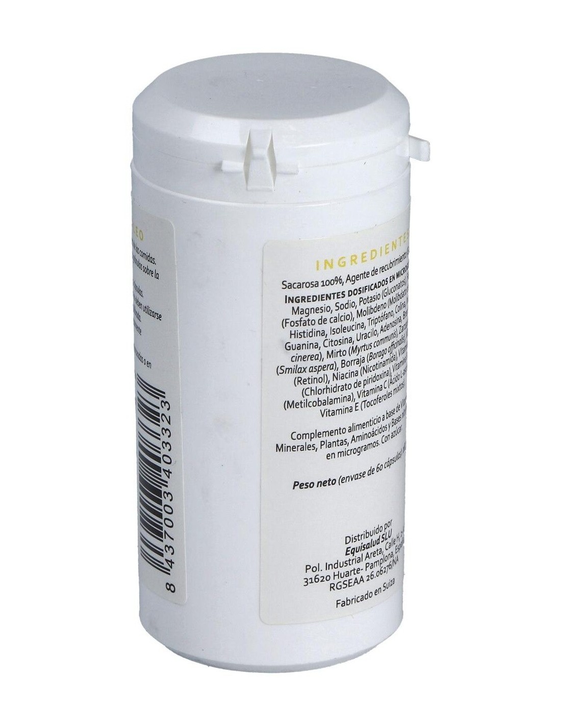 Minerales: magnesio, sodio y potasio (gluconatos), fósforo (fosfato de calcio), molibdeno (molibdato de sodio). Aminoácidos: histidina, isoleucina, triptófano, colina, inositol, guanina, citosina, uracilo, adenosina. Plantas: brezo (Erica cinerea), mirto (Myrtus communis), zarzaparrilla (Smilax aspera), borraja (Borago officinalis). Vitaminas: vitamina A (retinol), niacina (nicotinamida), vitamina B6 (clorhidrato de piridoxina), vitamina B12 (metilcobalamina), vitamina C (ácido L-ascórbico), vitamina E (mezcla de tocoferoles). Envoltura: Agente de recubrimiento (gelatina), sacarosa 100%.