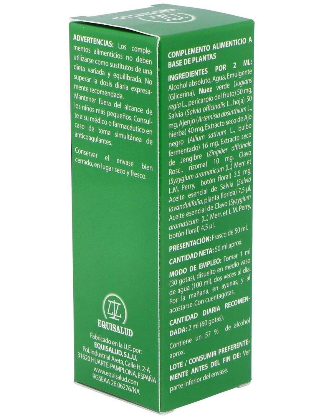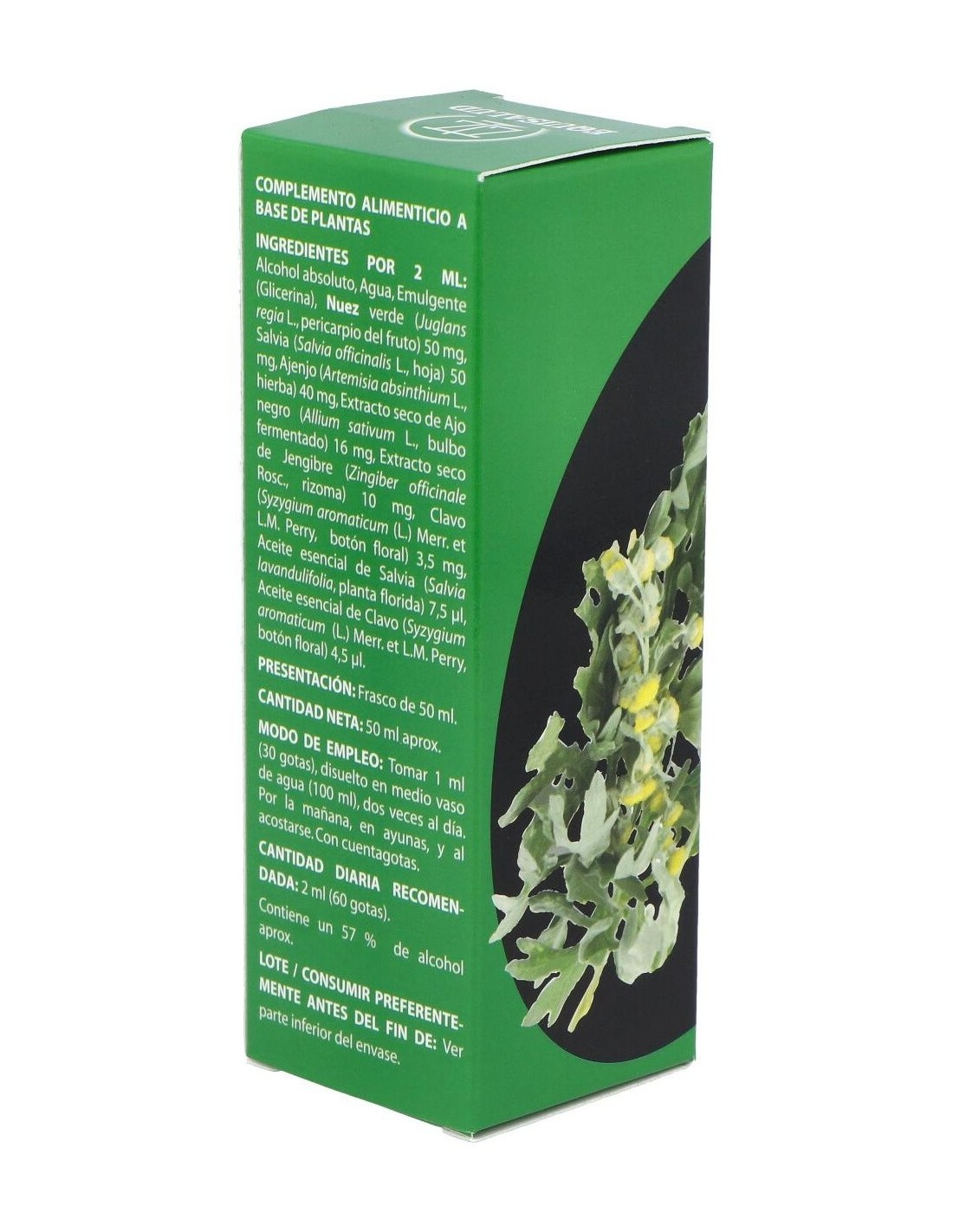 Composición por cápsula: Nuez verde (Juglans regia L., pericarpio del fruto), 1.250 mg; salvia (Salvia oficinalis L., hoja, 15 ml/Kg aceite esencial), 1.250 mg; ajenjo (Artemisa absinthium L., hierba, 2 ml/Kg aceite esencial), 1.000 mg; ajo negro extracto seco (Allium sativum L., bulbo fermentado, >1,0% S-alil-cistína (SAC)), 400 mg; jengibre extracto seco (Zingiber officinale Roscoe, rizoma, 5% gingerol), 250 mg; clavo (Syzygium aromaticum (L.) Merr. & L.M. Perry, botón floral, 150 ml/Kg aceite esencial), 87,5 mg; aceite esencial de salvia (Salvia officinalis L., planta florida), 187,5 µl y aceite esencial de clavo (Syzygium aromaticum (L.) Merr. & L.M. Perry, botón floral), 112,5 µg.