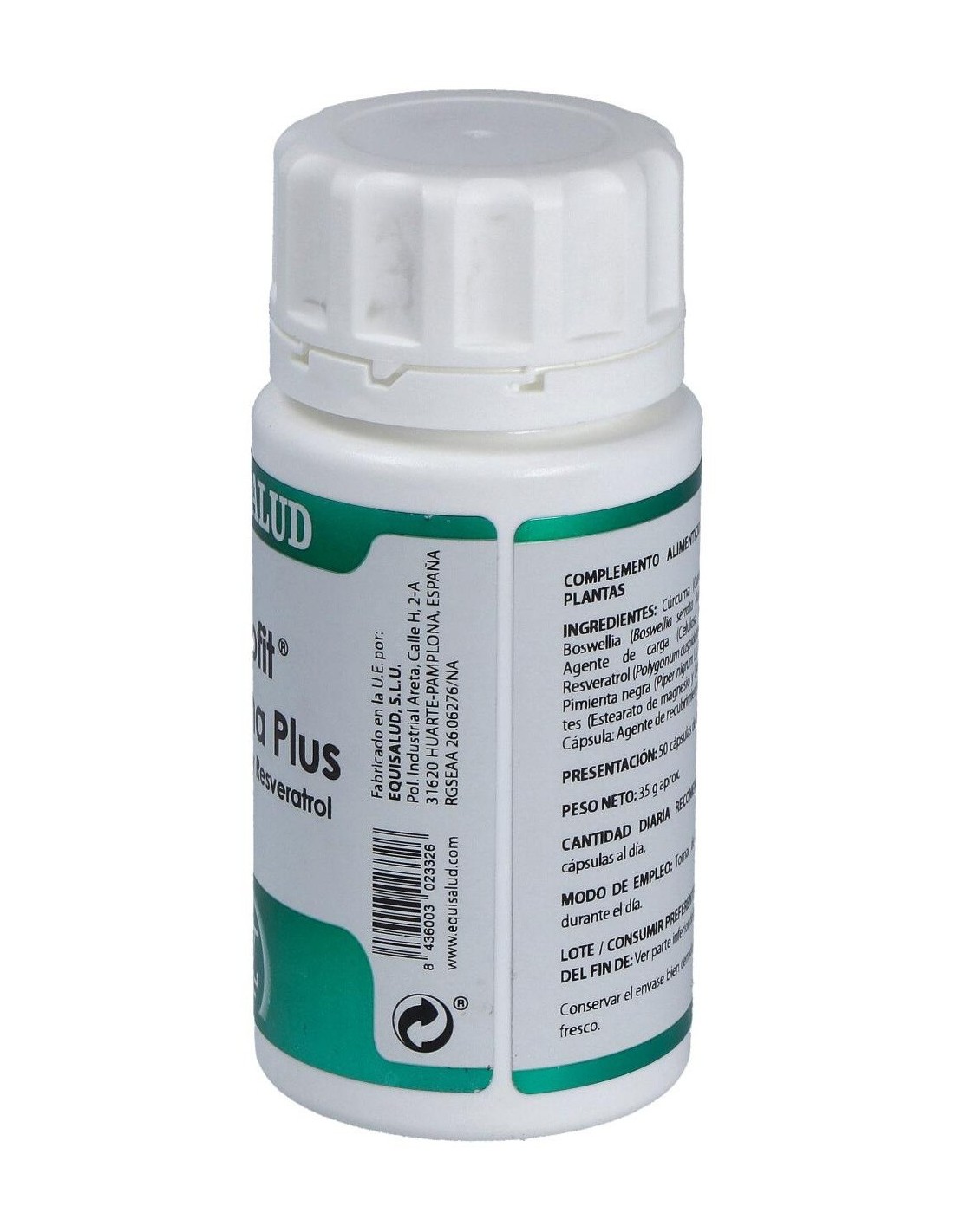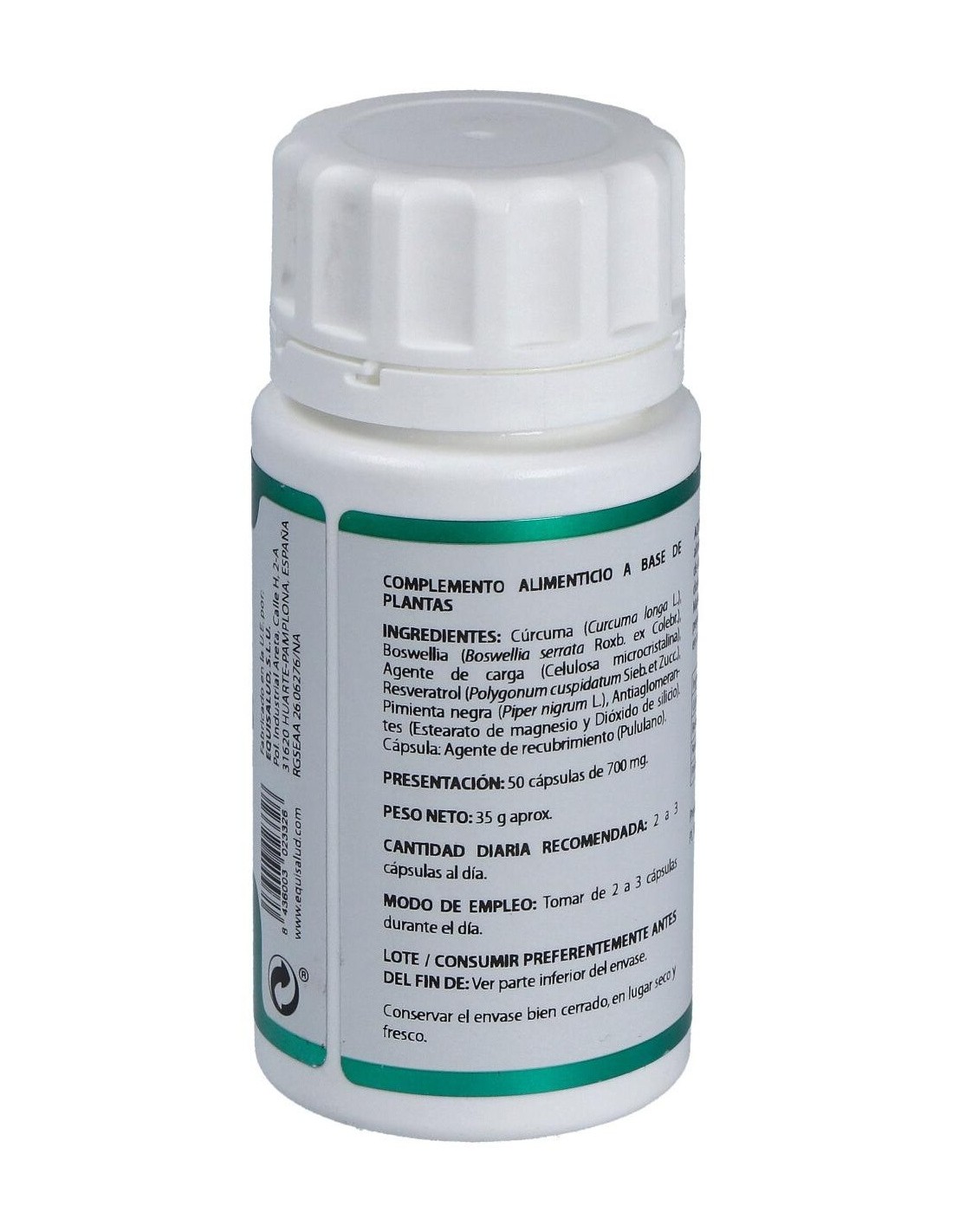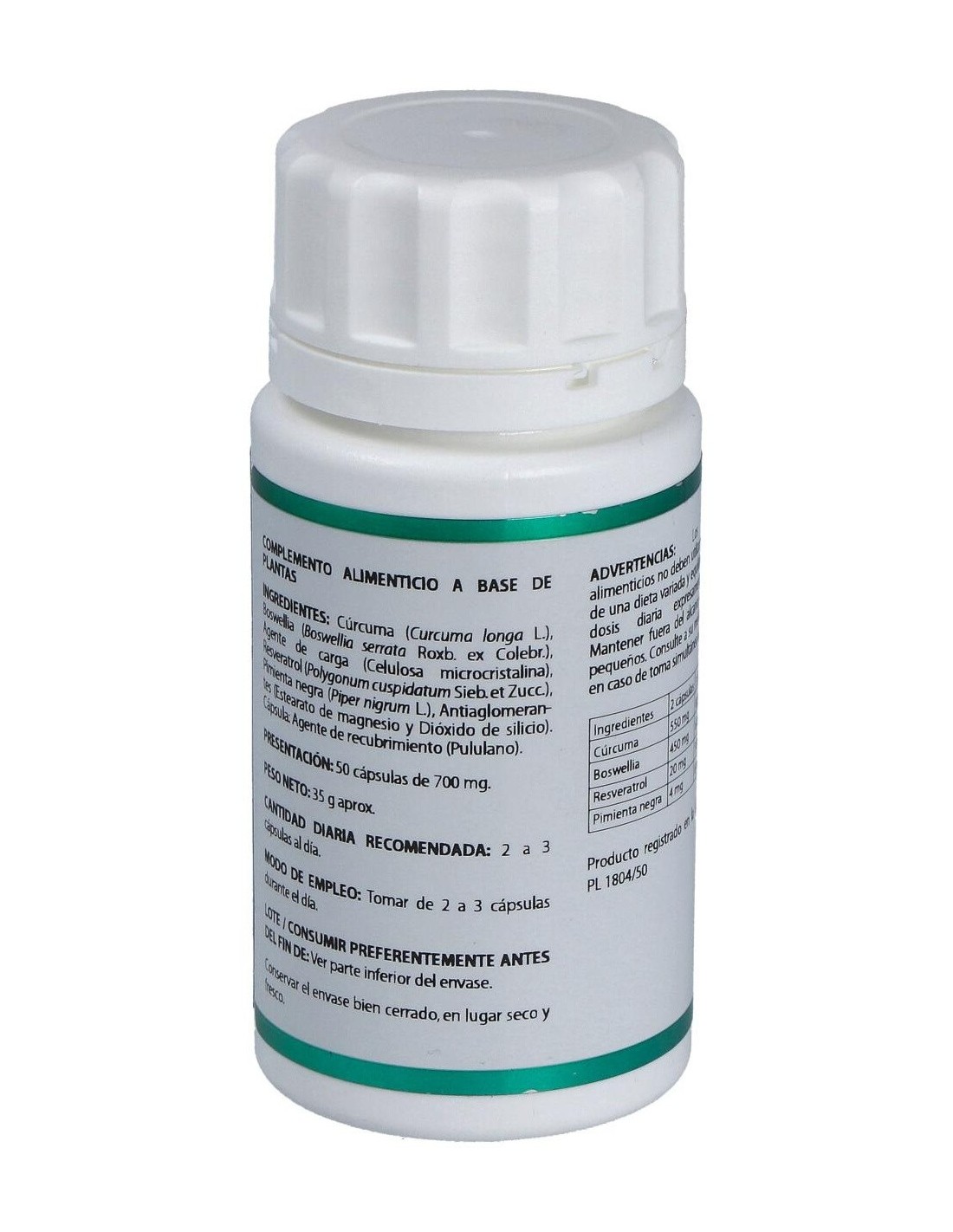 Cúrcuma extracto nebulizado (Curcuma longa L.), 275 mg: boswellia extracto seco (Boswellia serrata Roxb. ex Colebr.), 225 mg: resveratrol (Polygonum cuspidatum Sieb. et Zucc.), 10 mg: pimienta negra extracto seco (Piper nigrum L.), 2 mg. Envoltura: polisacárido de origen vegetal (pululano).