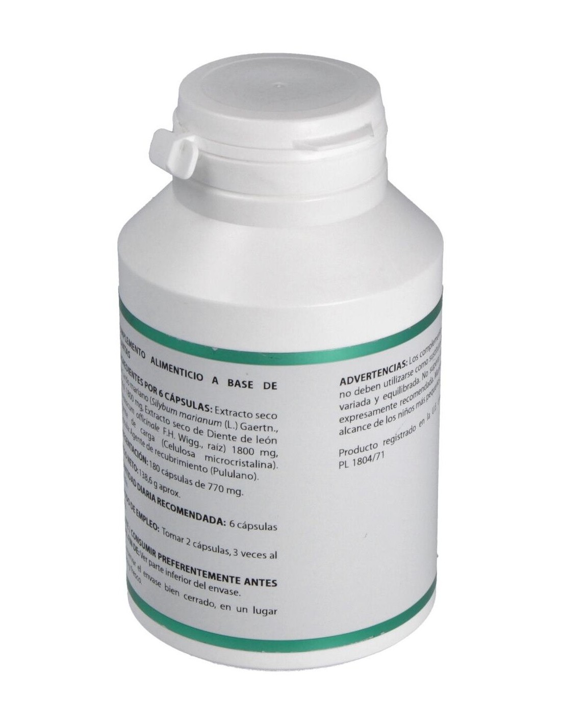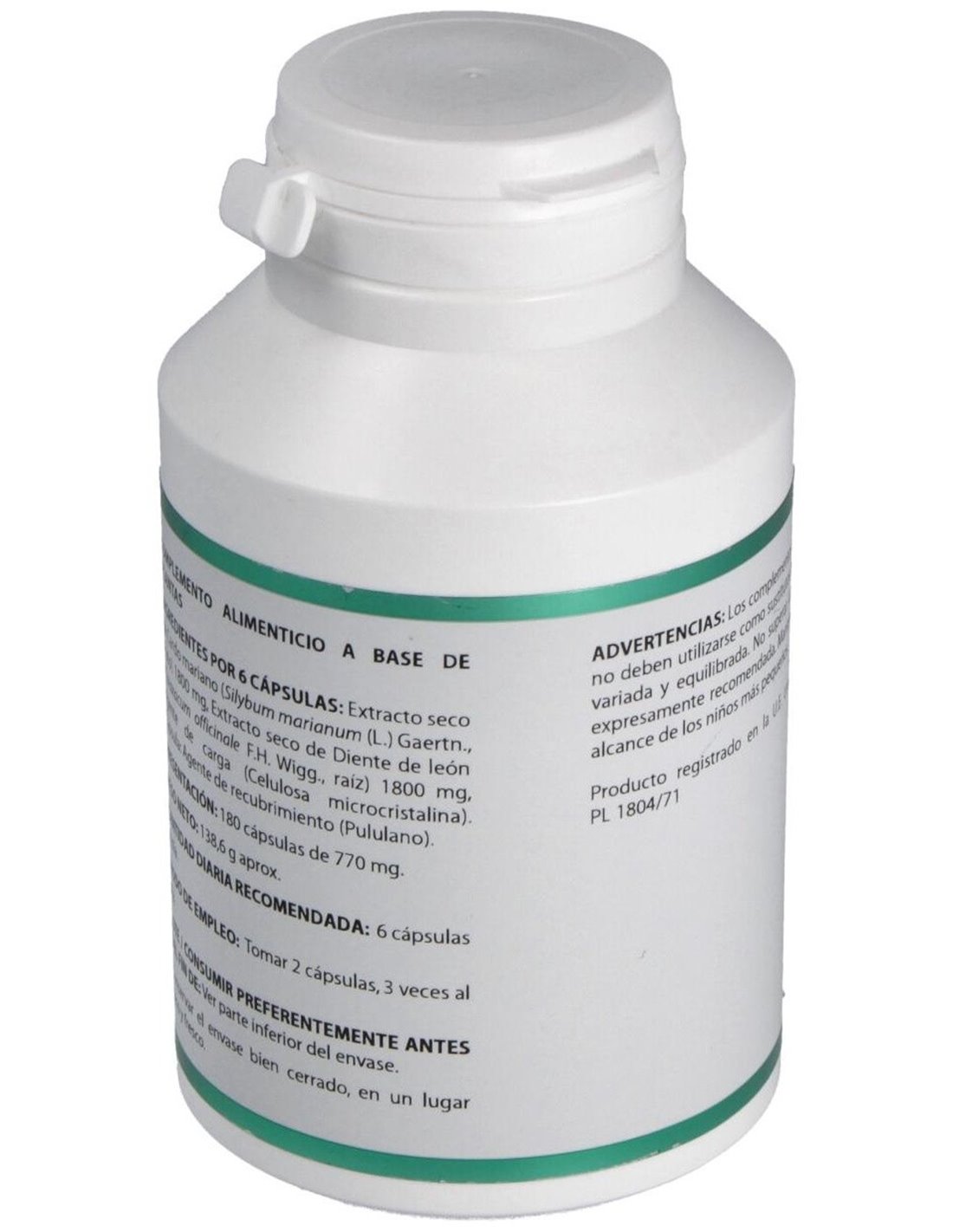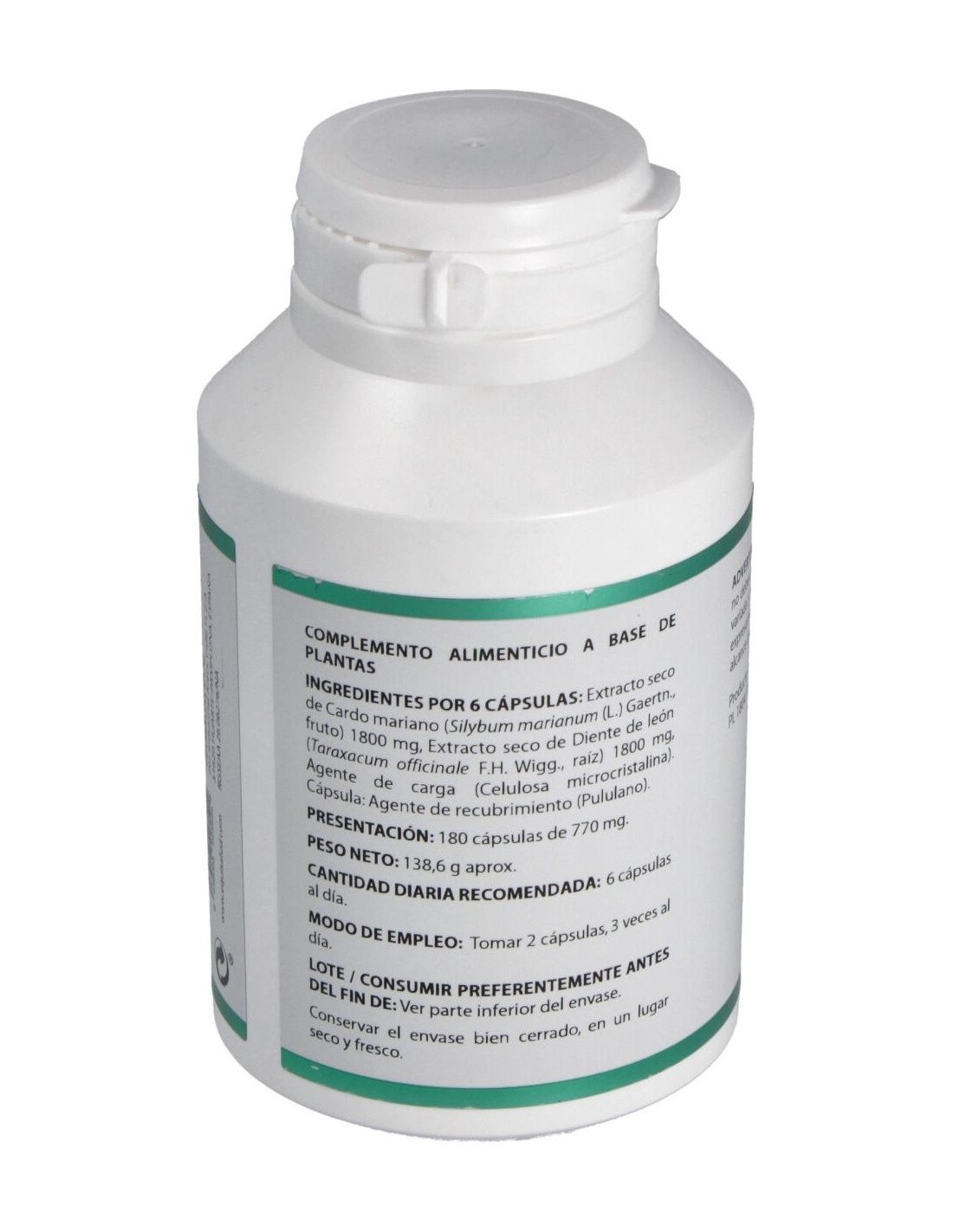 Cardo mariano extracto seco (Silybum marianum (L.) Gaertn.), 300 mg: diente de león extracto seco (Taraxacum officinale F.H. Wigg.), 300 mg. Envoltura: polisacárido de origen vegetal (pululano).