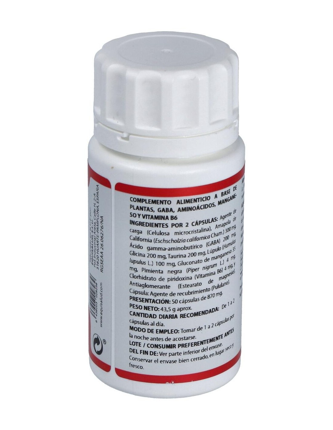 Amapola de California extracto nebulizado (Eschscholzia californica Cham.), 150 mg: ácido gamma-aminobutírico (GABA), 100 mg: glicina, 100 mg: taurina, 100 mg: lúpulo extracto nebulizado (Humulus lupulus L.), 50 mg: gluconato de manganeso (11,42% manganeso), 17,5 mg: pimienta negra extracto seco (Piper nigrum L.), 2 mg: vitamina B6 (clorhidrato de piridoxina), 2 mg. Envoltura: polisacárido de origen vegetal (pululano)