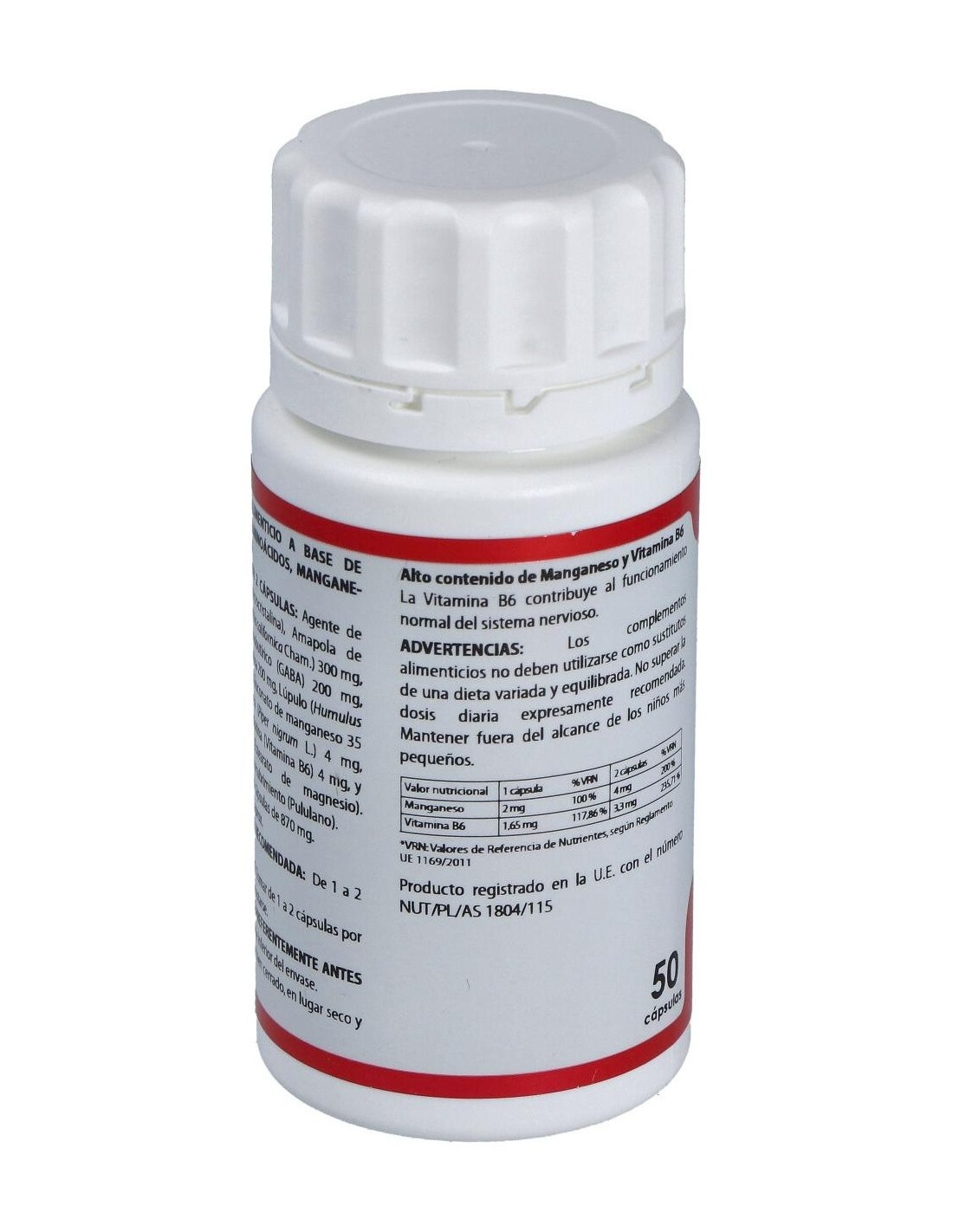Suplemento a base de plantas, GABA, aminoácidos, manganeso y vitamina B6. El manganeso y la vitamina B6 contribuyen al metabolismo energético normal. La vitamina B6 contribuye al funcionamiento normal del sistema nervioso. Apto para vegetarianos, diabéticos y pacientes con dietas restrictivas.