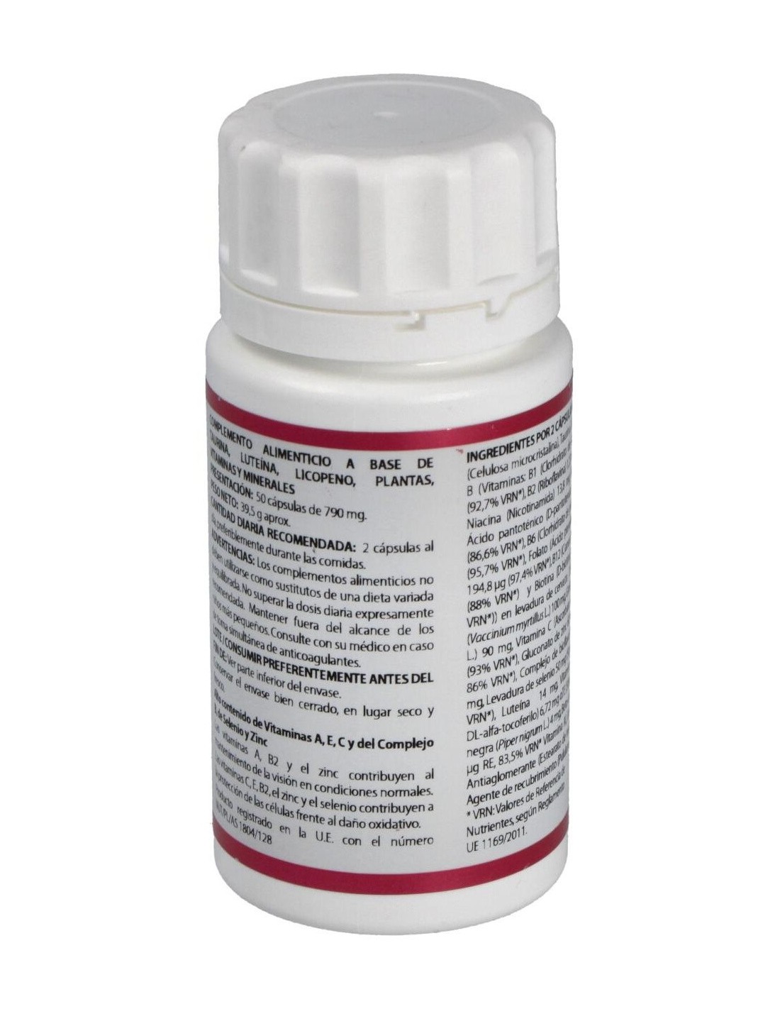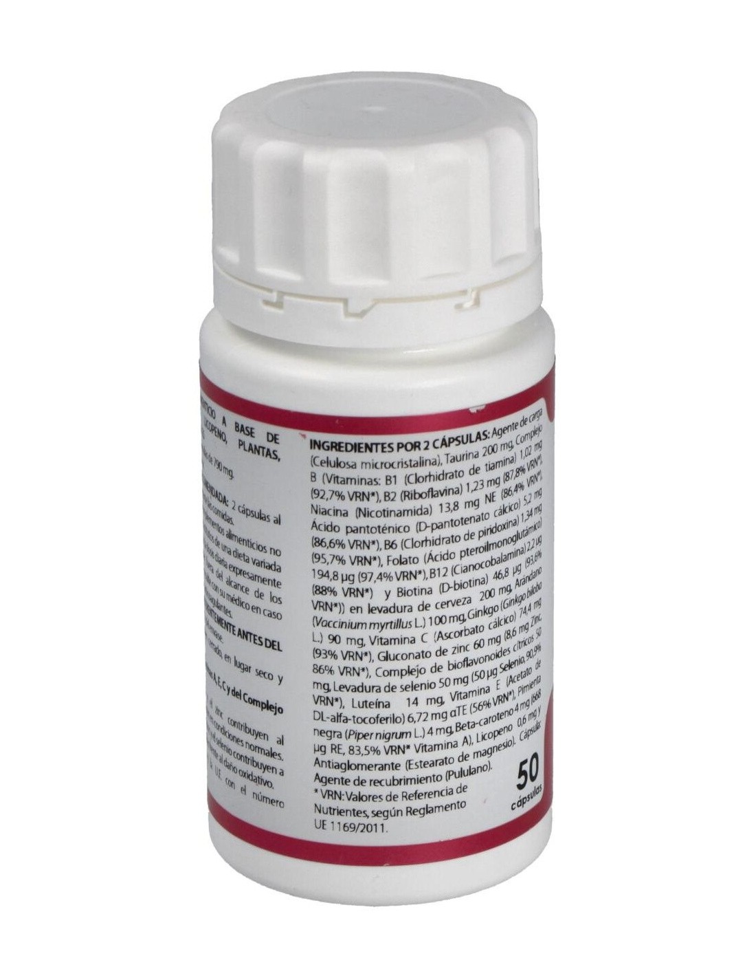 Taurina, 100 mg: complejo B (vitaminas: B1 (clorhidrato de tiamina), B2 (riboflavina), niacina (nicotinamida), ácido pantoténico (D-pantotenato cálcico), B6 (clorhidrato de piridoxina), folato (ácido pteroilmonoglutámico), B12 (cianocobalamina) y biotina (D-biotina)) en levadura de cerveza, 100 mg: arándano extracto seco (Vaccinium myrtillus L.), 50 mg: ginkgo extracto seco (Ginkgo biloba L.), 45 mg: vitamina C (ascorbato cálcico), 37,2 mg: gluconato de zinc (14,35% zinc), 30 mg: complejo de bioflavonoides cítricos (>50% flavonoides totales), 25 mg: levadura enriquecida con selenio (selenio 1.000 ppm), 25 mg (aporta 25 µg de selenio): luteína (>10% luteína), 7 mg: vitamina E (acetato de DL-alfa-tocoferilo), 3,36 mg: pimienta negra extracto seco (Piper nigrum L.), 2 mg: beta-caroteno (>10% beta-caroteno), 2 mg: licopeno (>3% licopeno), 0,3 mg. Envoltura: polisacárido de origen vegetal (pululano).