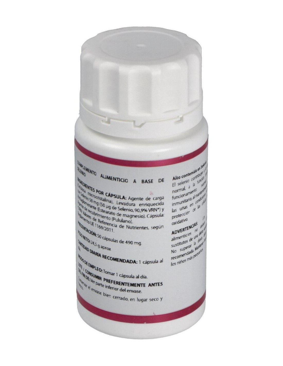 Levadura enriquecida con Se, Celulosa microcristalina y Estearato de magnesio. Envoltura de polisacárido de origen vegetal (pululano).