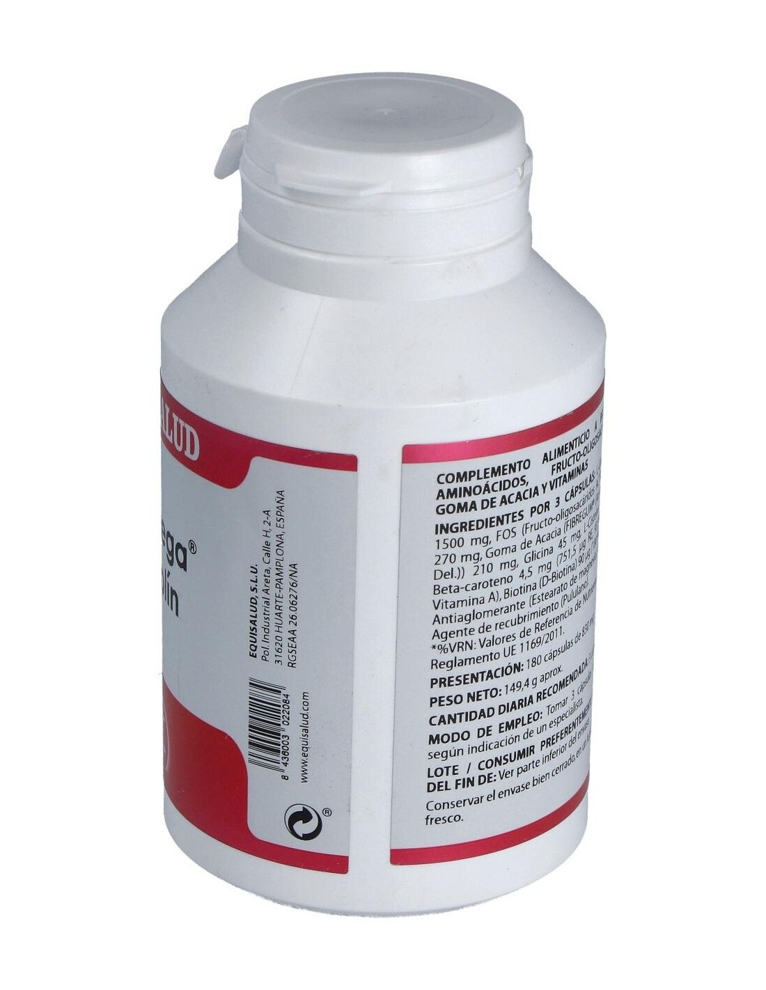 Complemento alimenticio a base de aminoácidos, fructo-oligosacáridos, goma de acacia y vitaminas. Alto contenido de vitamina A y biotina: la vitamina A y la biotina contribuyen al mantenimiento de las mucosas en condiciones normales, y al funcionamiento normal del sistema inmunitario y del sistema nervioso, respectivamente.