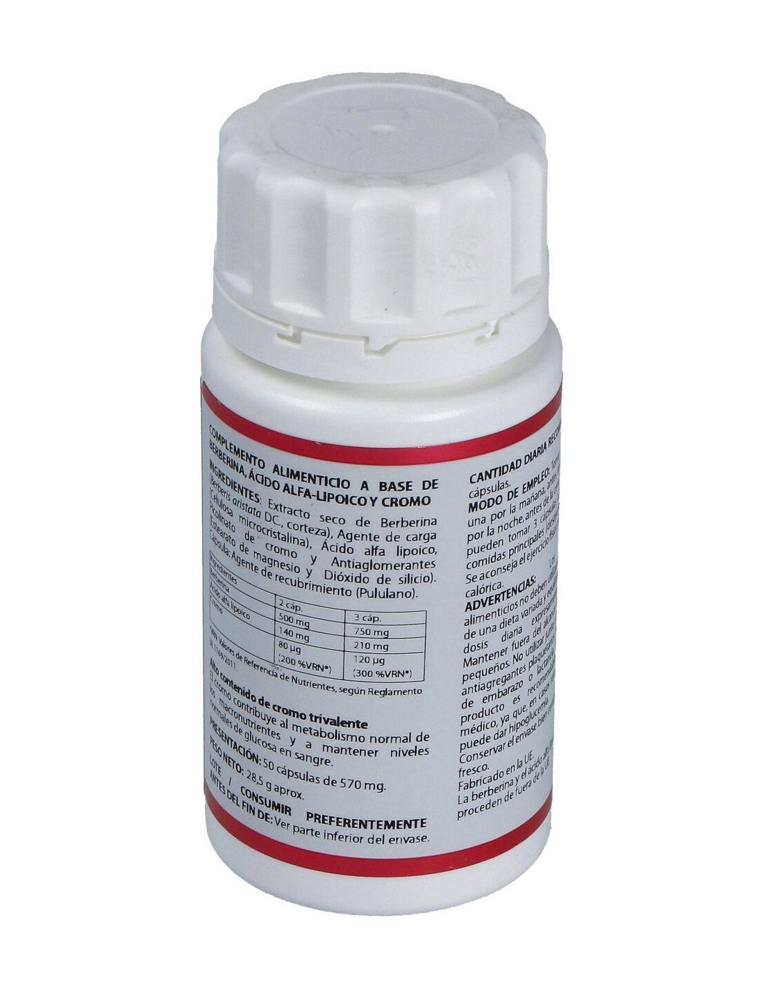 Berberina extracto seco (Berberis aristata DC.), 250 mg: ácido alfa-lipoico, 70 mg: picolinato de cromo (12,3% cromo), 40 µg. Envoltura: polisacárido de origen vegetal (pululano).