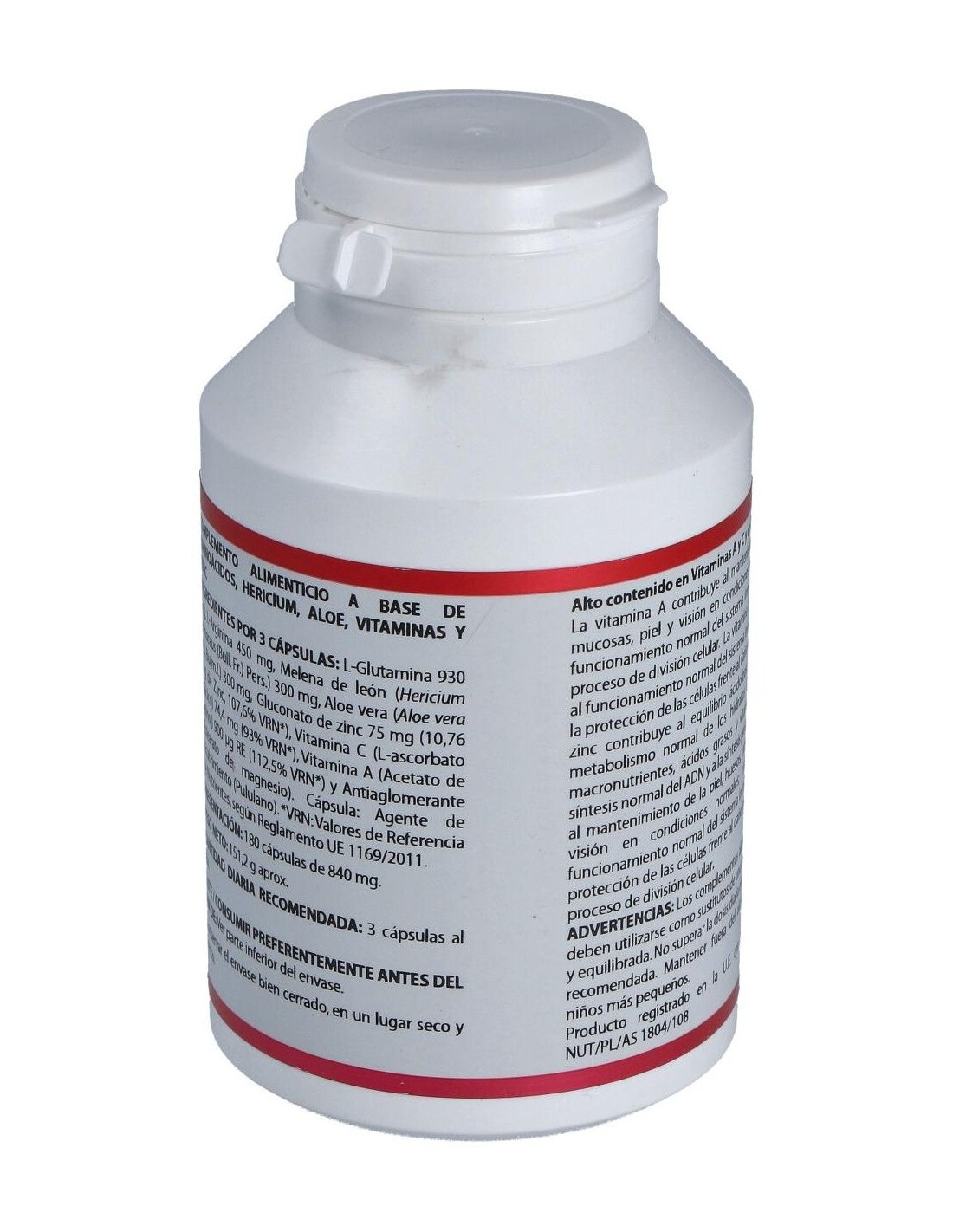Aloe vera, Estearato de magnesio c.s. Gluconato de Zinc, L-arginina, L-glutamina, Melena de león (Hericium erinaceus), Vitamina A (Retinol), Vitamina C. Envoltura de poliscárido de origen vegetal (pululano)