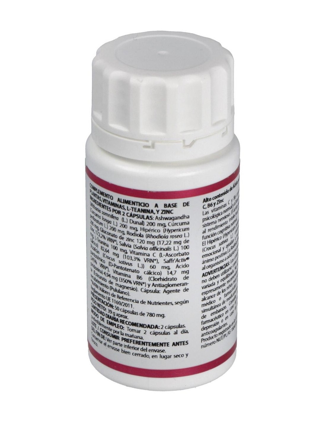 ASHWAGANDHA EXTRACTO SECO (WITHANIA SOMNIFERA (L.) DUNAL), 100 MG; CÚRCUMA EXTRACTO SECO (CURCUMA LONGA L.), 100 MG; HIPÉRICO EXTRACTO SECO (HYPERICUM PERFORATUM L.), 100 MG; RODIOLA EXTRACTO SECO (RHODIOLA ROSEA L.), 100 MG; GLUCONATO DE ZINC (14,35% ZINC), 60 MG; SALVIA EXTRACTO SECO (SALVIA OFFICINALIS L.), 50 MG; L-TEANINA, 50 MG; ÁCIDO ASCÓRBICO (ASCORBATO CÁLCICO), 41,32 MG; AZAFRÁN EXTRACTO SECO SAFFR'ACTIV® (CROCUS SATIVUS L.), 30 MG; ÁCIDO PANTOTÉNICO (D-PANTOTENATO CÁLCICO), 7,35 MG; VITAMINA B6 (PIRIDOXINA CLORHIDRATO), 2,47 MG. EXCIPIENTES TECNOLÓGICOS: ESTEARATO DE MAGNESIO (ANTIAGLOMERANTE), C.S.