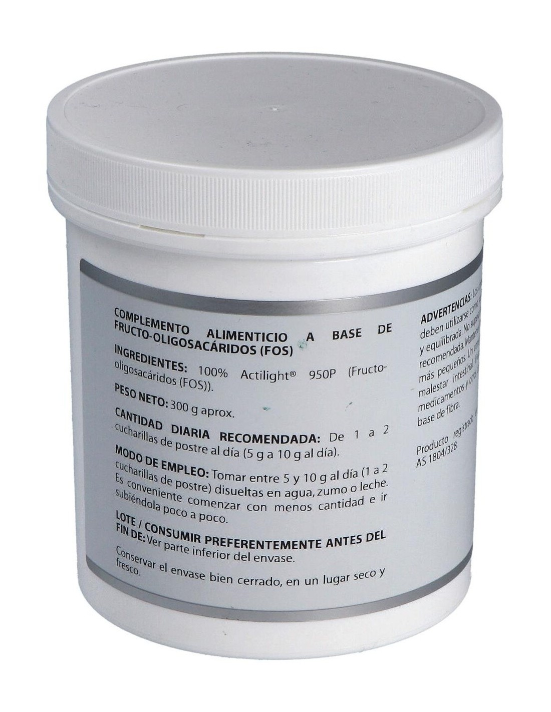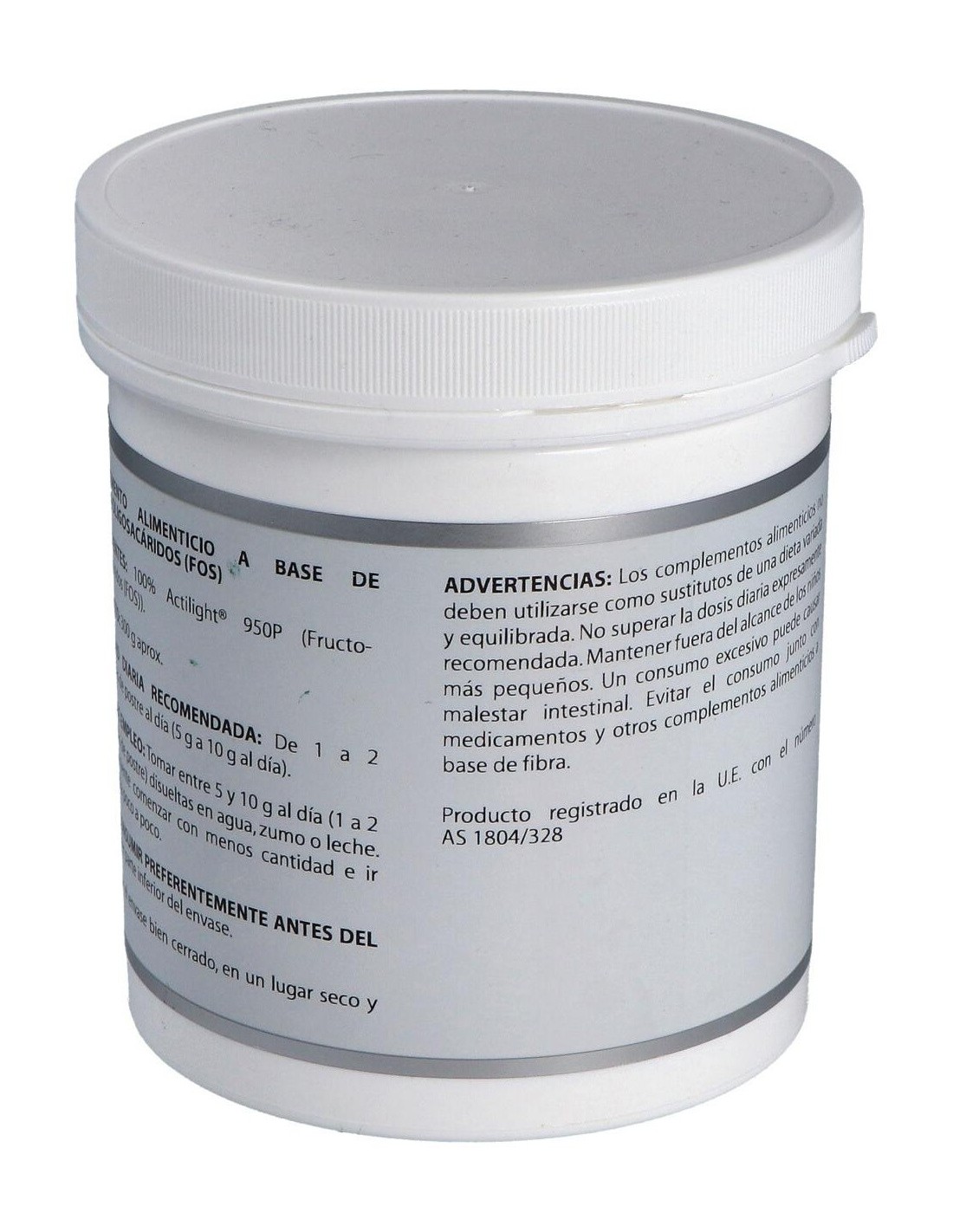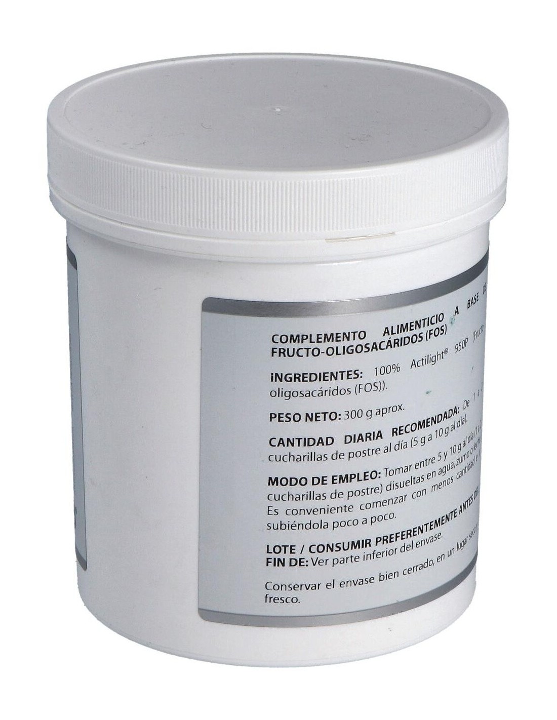 Los FOS o fructo-oligosacáridos son oligosacáridos formados en este caso por 3 a 5 moléculas de fructosa. También se llaman oligofructosas u oligofructanos. Tienen poder edulcorante de aproximadamente la mitad que la sacarosa. Pero no se absorben por el intestino luego, no pasan a sangre y ni siquiera son rotas sus moléculas para formar moléculas de fructosa.Atrapan agua en su estructura lo que se traduce en un aumento del contenido intestinal, favoreciendo el tránsito del mismo, así como creando una sensación de saciedad, que puede ayudar a comer menos y a adelgazar.Actúan como prebióticos, es decir, como alimento para las bacterias intestinales, al ser fermentados por ellas. Esta fermentación produce además de mayor proliferación de Bifidobacterium (bacterias buenas) una disminución del pH, lo cual ayuda a disminuir el riesgo cancerígeno de algunas sustancias derivadas de ácidos biliares o algunos ácidos grasos, que se inactivan con la acidez y que de lo contrario pueden dar lugar a células cancerosas.Producen un mejor aprovechamiento del calcio y el magnesio, ya que al bajar el pH el calcio y el magnesio se hacen más solubles y son liberados mejor de los alimentos.Son modificadores de la flora bacteriana del color, lo equilibran, dando lugar a una mejor absorción de los alimentos y en general al mejor funcionamiento del colon, así como a una saludable respuesta inmunológica por la estrecha relación que hay entre ambos. Además mejoran la síntesis de algunas vitaminas.El equilibrio intestinal que producen reduce la existencia de gases y de malas y olorosas fermentaciones. Previenen infecciones intestinales, al controlar mejor a levaduras como Candida albicans.Estimulan principalmente a las bacterias tipo Bifidobacterium, pero en algunos casos en que haya un gran desequilibrio (disbiosis) podría producir gases debido a la fermentación producida por bacterias nocivas como Klebsiella. E.coli y algún Clostridium (se forma H2 y CO2). Normalmente la ingesta de FOS lo que hace es inhibir el crecimiento de E.coli o Shigela o Salmonella.Pueden ayudar a adelgazar por el efecto saciante que producen y por la optimización del metabolismo energético al mejorar la absorción de los alimentos.Disminuyen la ingesta de colesterol lo cual pueda ayudar a bajar la tensión, además de perder peso, que también puede ayudar en la hipertensión.Mejoran la absorción de las isoflavonas en la dieta, ayudando a mejorar la osteoporosis en la mujer.Ingredientes activos:300 gramos de Actilight® 950P (Fructo-oligosacáridos (FOS)).Modo de empleo:Tomar entre 5 y 10 gramos al día (1 a 2 cucharillas de postre) disueltas en agua, zumo o leche.Presentación:Bote de 300 gramos.