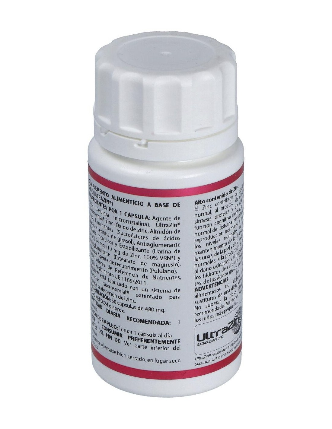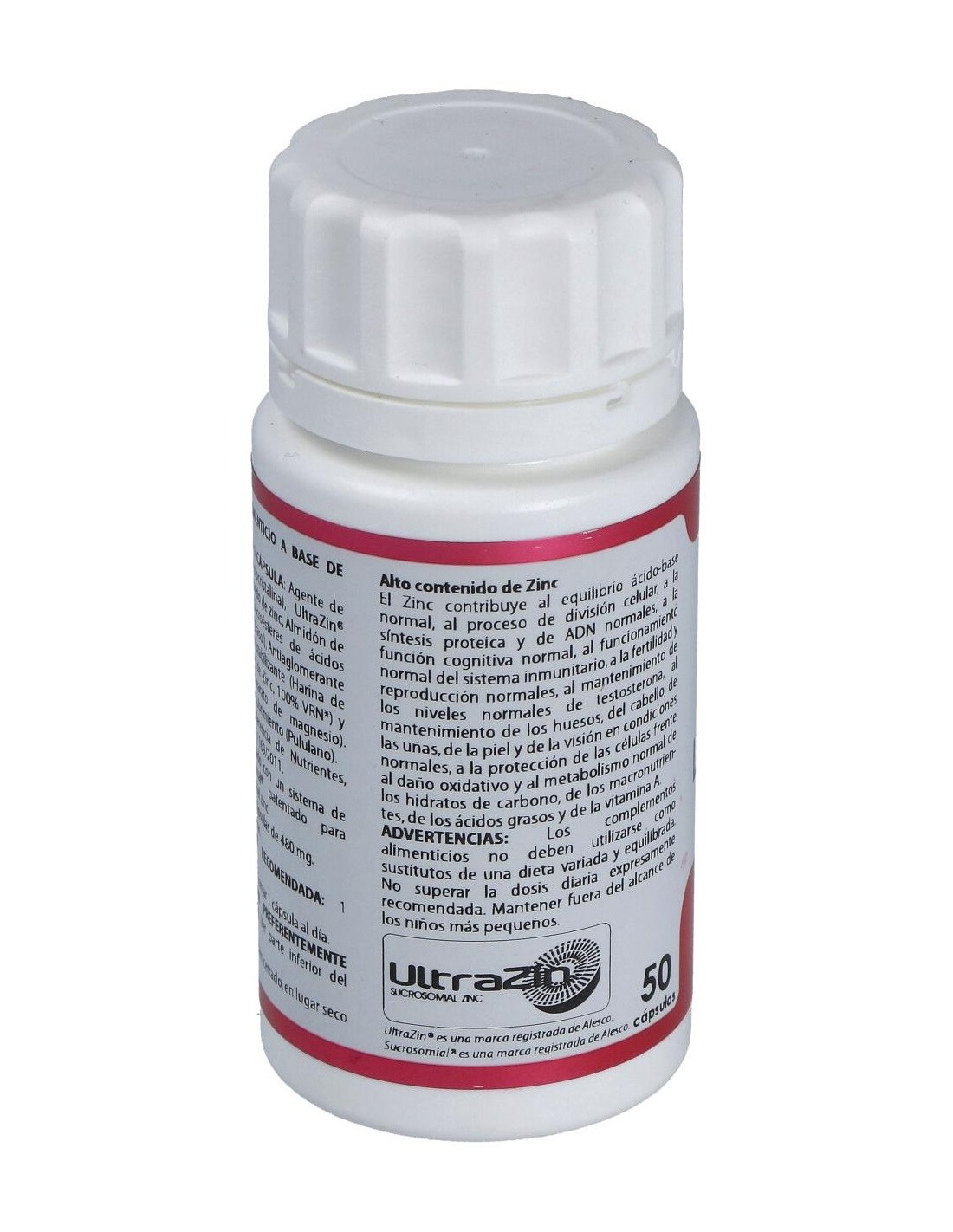 ULTRAZIN* (SUCROSOMIAL® ZINC, ZINC LIPOSOMADO, 42-52 % ZINC), 24 MG. EXCIPIENTE TECNOLÓGICO: CELULOSA MICROCRISTALINA (AGENTE DE CARGA), C.S. Y ESTEARATO DE MAGNESIO (ANTIAGLOMERANTE), C.S. ENVOLTURA: POLISACÁRIDO DE ORIGEN VEGETAL (PULULANO).