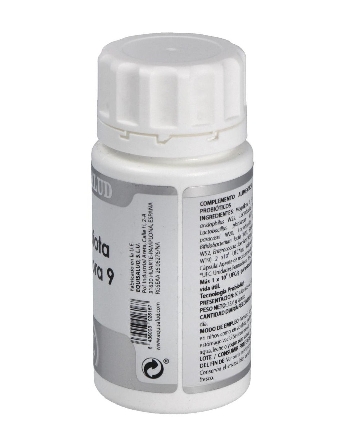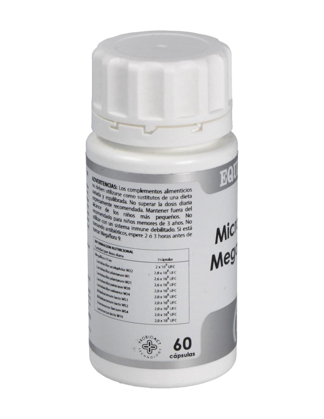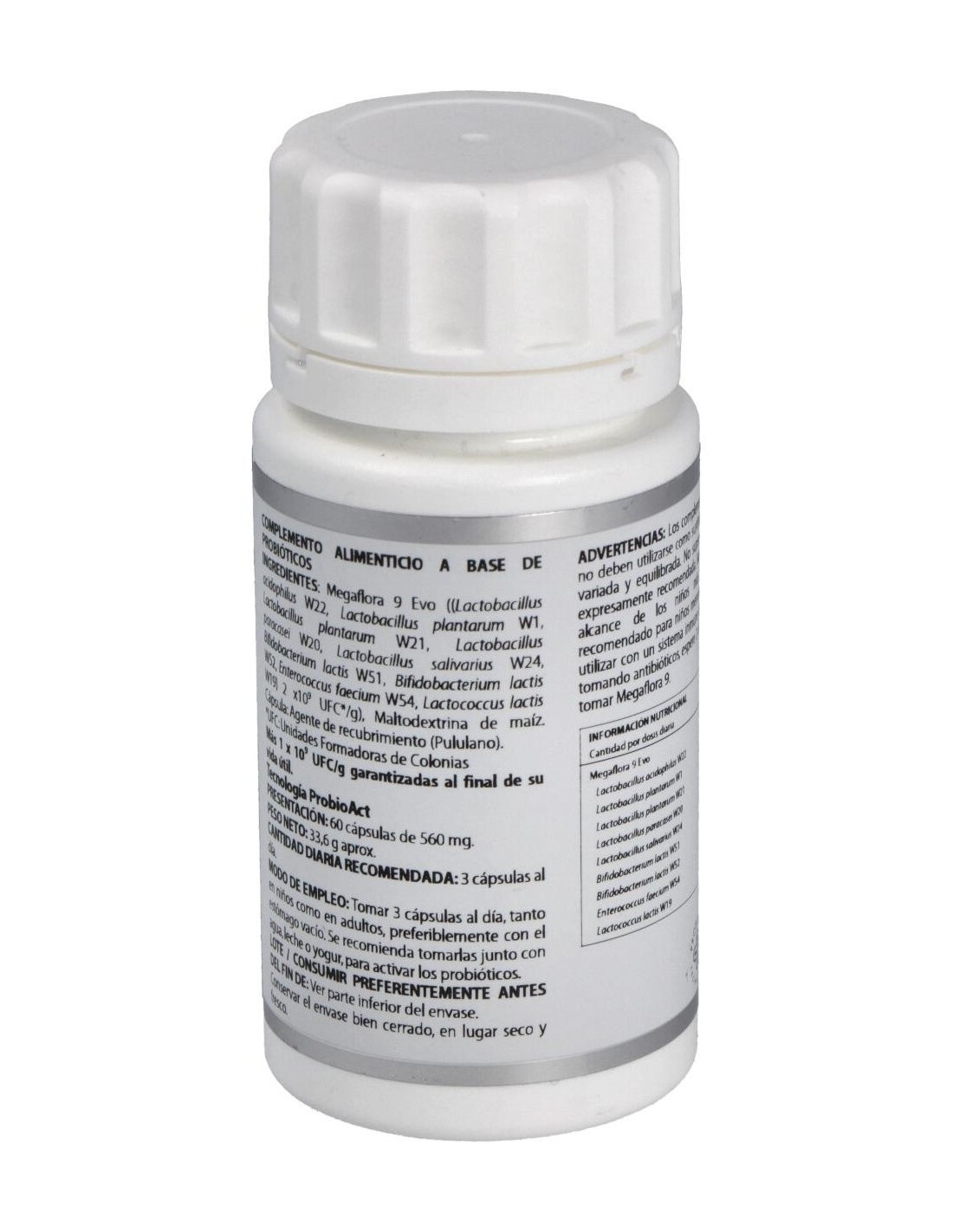 Megaflora 9® ((Bifidobacterium lactis W51, Bifidobacterium lactis W52, Enterococcus faecium W54, Lactobacillus acidophilus W22, Lactobacillus paracasei W20, Lactobacillus plantarum W21, Lactobacillus salivarius W24, Lactococcus lactis W19) 1x109 UFC/g), 990 mg. Excipiente tecnológico: maltodextrina de maíz (agente de carga). Envoltura: agente de recubrimiento (hidroxipropilmetilcelulosa) y gelificante (goma gellan).