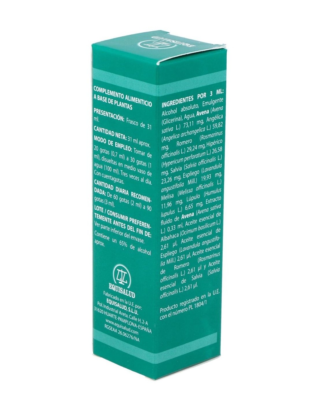 Avena (Avena sativa L.), angélica (Angelica archangelica L.), romero (Rosmarinus officinalis L.), hipérico (Hypericum perforatum L.), salvia (Salvia officinalis L.), espliego (Lavandula angustifolia Mill.), melisa (Melissa officinalis L.), lúpulo (Humulus lupulus L.) y albahaca (Ocimum basilicum L.). Diluyentes: alcohol absoluto, glicerina y agua purificada.