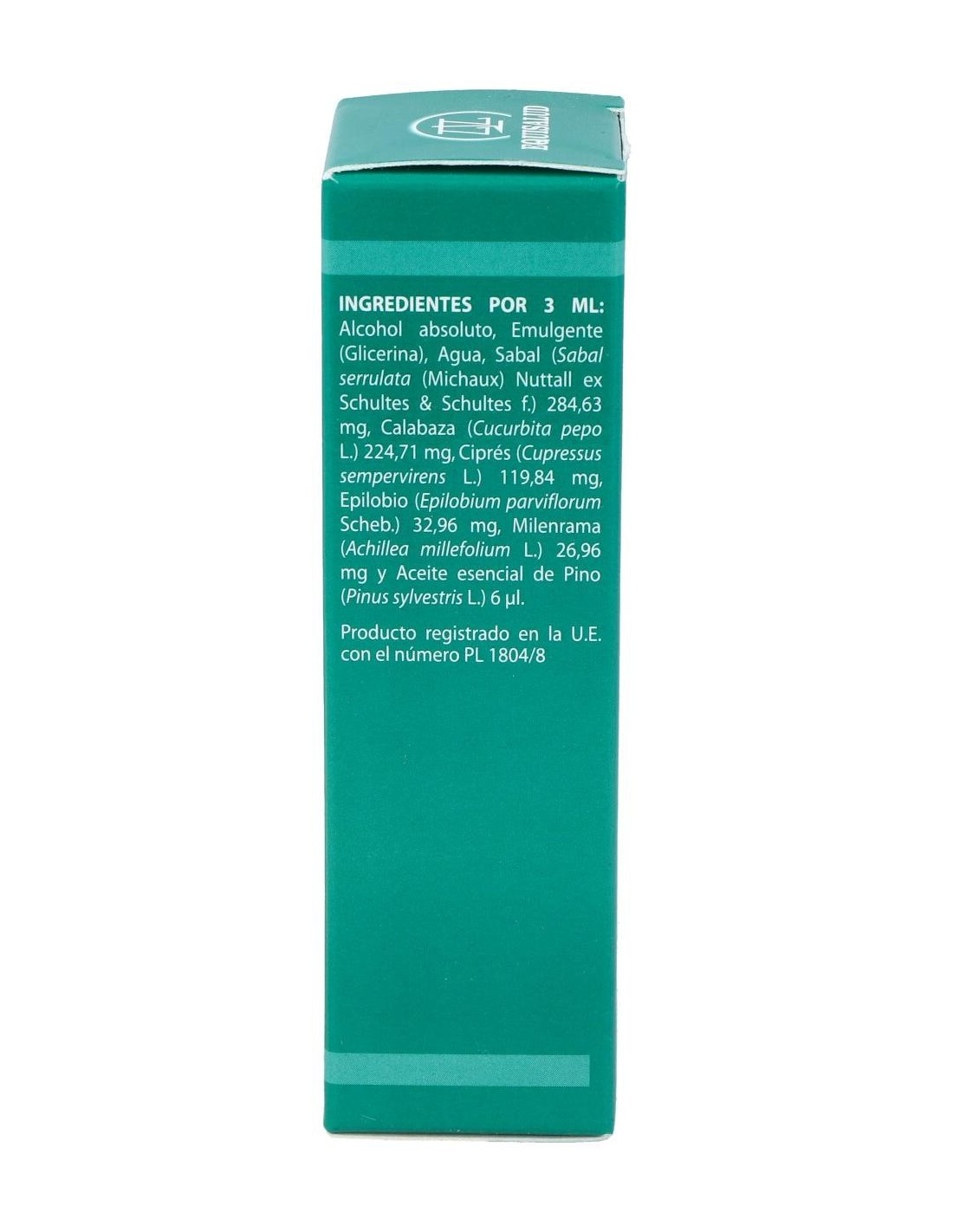 Sabal (Sabal serrulata (Michaux) Nuttall ex Schultes & Schultes f.), calabaza (Cucurbita pepo L.), ciprés (Cupressus sempervirens L.), epilobio (Epilobium parviflorum Scheb.), milenrama (Achillea millefolium L.) y pino (Pinus sylvestris L.) Diluyentes: alcohol absoluto, glicerina y agua purificada.