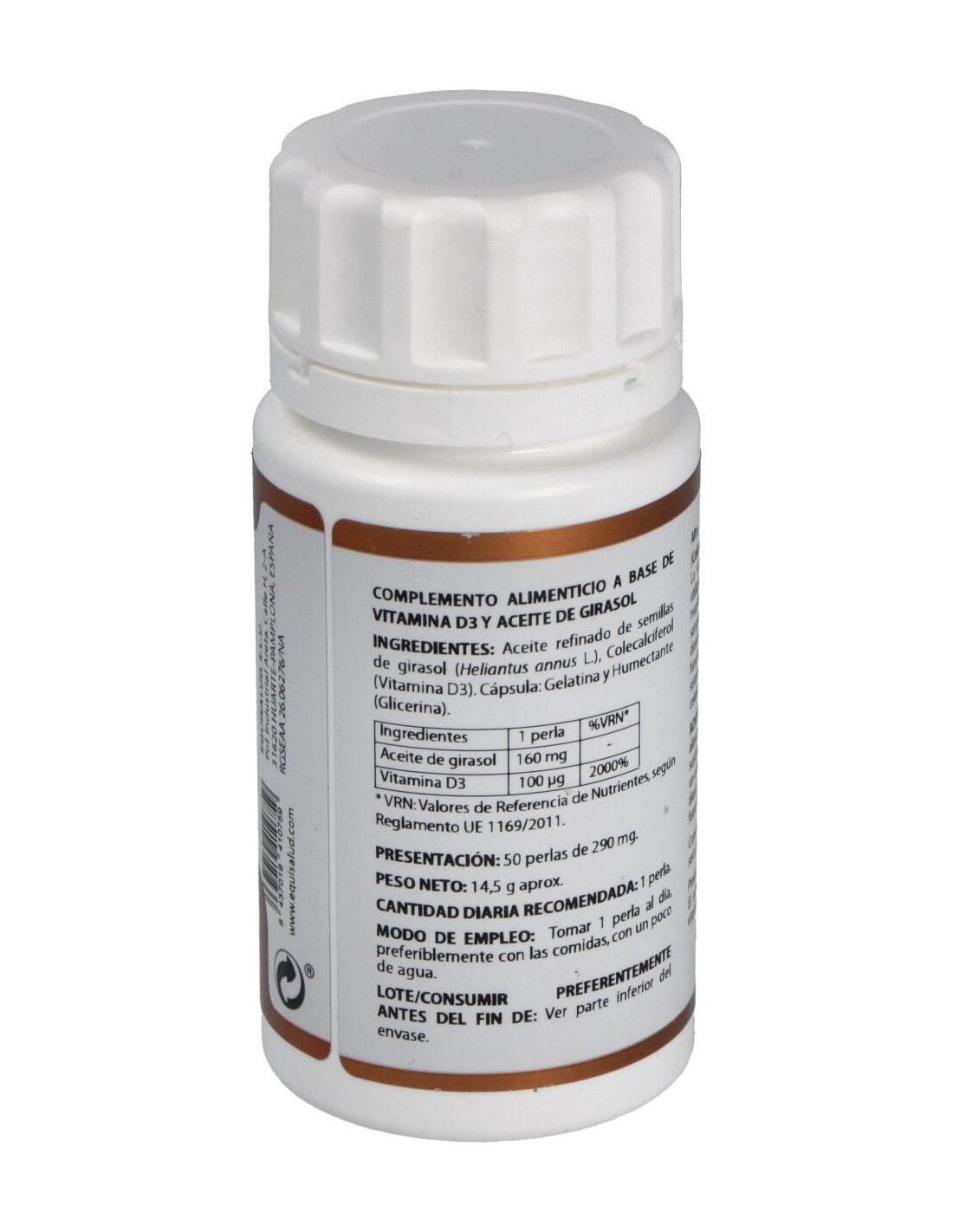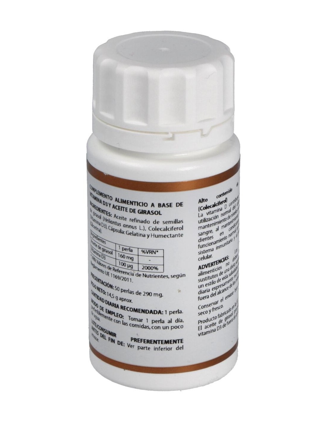 Complemento alimenticio a base de vitamina D3 y aceite de girasol. La vitamina D contribuye a la absorción y utilización normal del calcio y el fósforo, al mantenimiento de niveles normales de calcio en sangre, al mantenimiento de los huesos y dientes en condiciones normales, al funcionamiento normal de los músculos y del sistema inmunitario y al proceso de división celular.