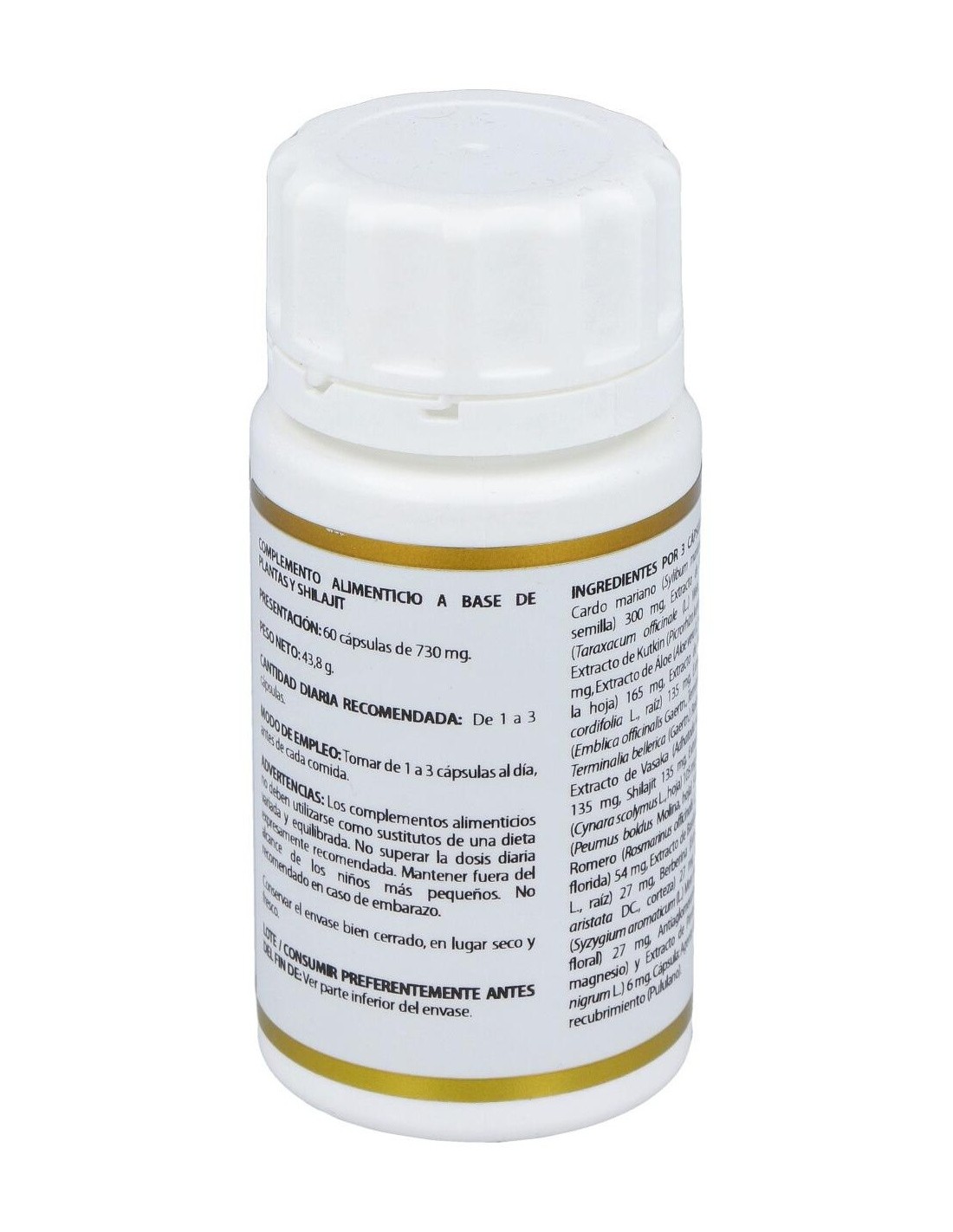Complemento alimenticio a base de plantas y shilajit. Algunos componentes de esta formulación, como el cardo mariano y el diente de león, tienen asociadas tradicionalmente propiedades depurativas en el organismo.