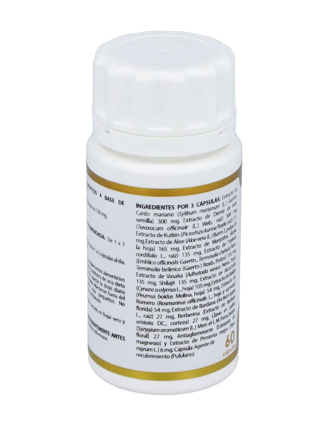 Cardo mariano extracto seco (Silybum marianum (L.) Gaertn., semilla, 80% silimarina, 30% silibina + isosibilina), 100 mg: diente de león extracto seco (Taraxacum officinale (L.) Web., raíz, 2% inulina), 100 mg: kutkin extracto seco (Picrorhiza kurroa Royle, raíz, 5% kutkina), 70 mg: aloe extracto seco (Aloe vera (L.) Burm. f., pulpa de la hoja, ratio 200:1), 55 mg: manjistha extracto seco (Rubia cordifolia L., raíz, ratio 10:1), 45 mg: triphala extracto seco (Emblica officinalis Gaertn., Terminalia chebula Retz., Terminalia bellerica (Gaertn.) Roxb., frutos, 30% taninos, ratio 20:1), 45 mg: vasaka extracto seco (Adhatoda vasica Nees, hojas, ratio 4:1), 45 mg: PrimaVie® (shilajit purificado, >50% ácidos fúlvicos, > 10,3% Dibenzo-a-pironas más Dibenzo-a-pironas cromoproteínas), 45 mg: alcachofa extracto seco (Cynara scolymus L., hojas, 5% cinarinas), 35 mg: boldo extracto seco (Peumus boldus Molina, hojas, 0,05% boldina), 18 mg: romero extracto seco (Rosmarinus officinalis L., hoja y sumidad florida, 2% ácido rosmarínico), 18 mg: bardana extracto seco (Arctium lappa L., raíz, 0,3% ácido clorogénico), 9 mg: berberina (extracto seco de Berberis aristata DC., corteza de las ramas, 97% berberina, ratio 100:1), 9 mg: clavo polvo (Syzygium aromaticum (L.) Merr. et L.M. Perry, botón floral, 150 ml/Kg de aceite esencial), 9 mg: pimienta negra extracto seco (Piper nigrum L., fruto, 95% piperina, ratio 25:1), 2 mg. Excipiente tecnológico: estearato de magnesio (antiaglomerante), c.s. Envoltura: polisacárido de origen vegetal (pululano).