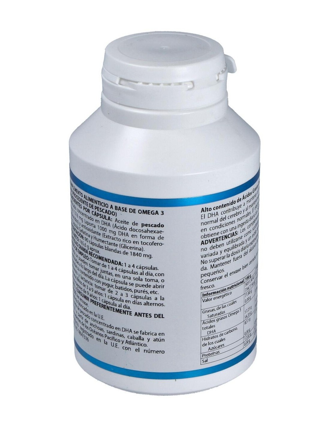 Complemento alimenticio a base de omega-3 DHA. El ácido docosahexaenoico (DHA) contribuye a mantener el funcionamiento normal del cerebro y al mantenimiento de la visión en condiciones normales. El efecto beneficioso se obtiene con una ingesta diaria de 250 mg de DHA.