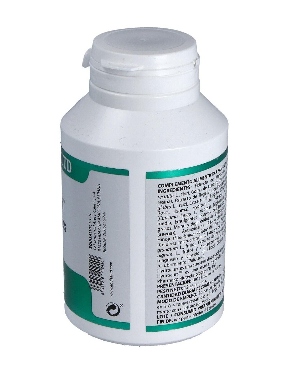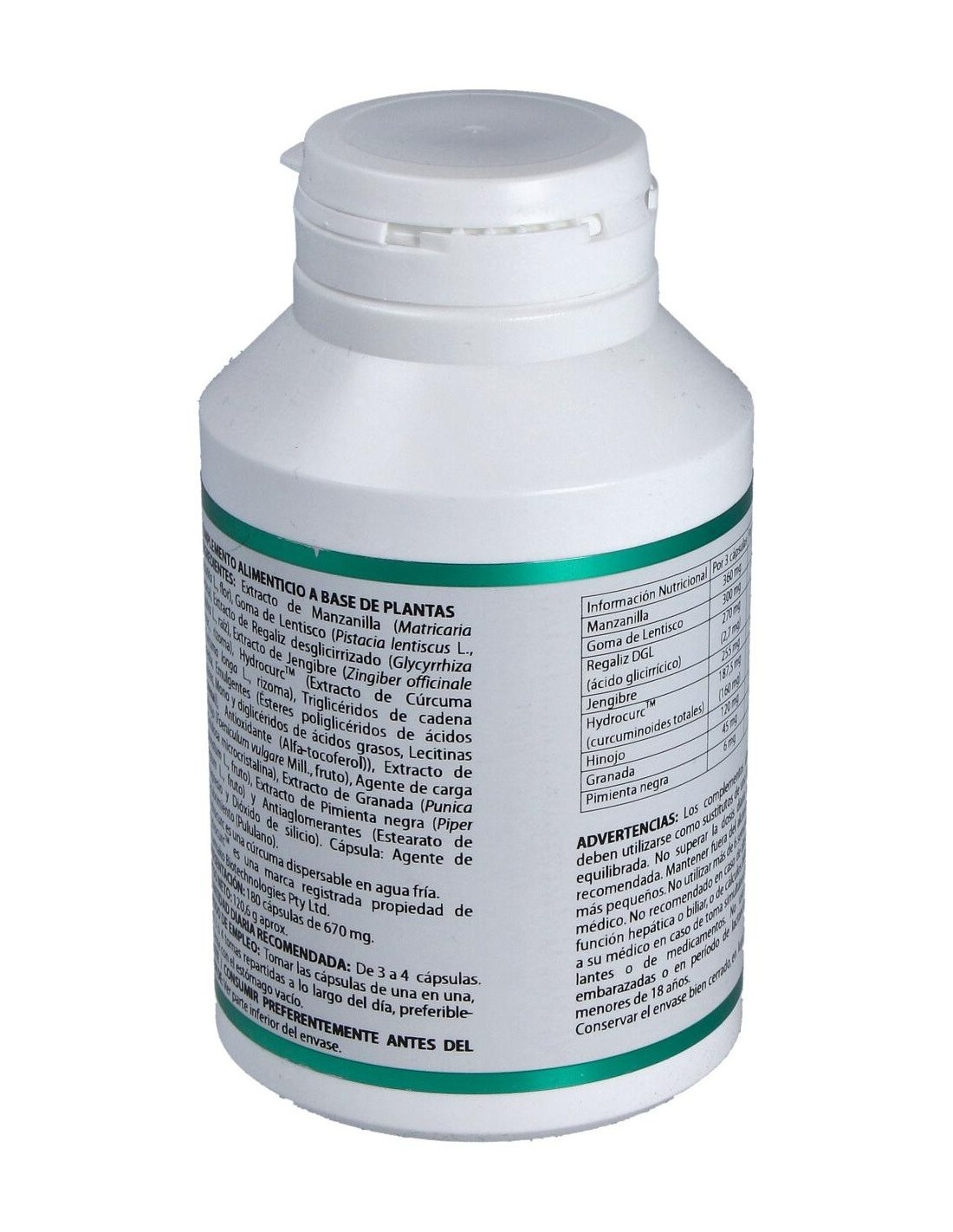 Manzanilla extracto seco (Matricaria recutita L.), 120mg; goma de lentisco (Pistacia lentiscus L.), 100 mg; regaliz desglicirrizado extracto seco (Glycyrrhiza glabra L.), 90 mg; jengibre extracto seco (Zingiber officinale Rosc.), 85 mg; HydroCurcTM (extracto de cúrcuma (Curcuma longa L.), 62,5 mg; hinojo extracto seco (Foeniculum vulgare Mill.), 40 mg; granada extracto seco (Punica granatum L.), 15 mg; pimienta negra extracto seco (Piper nigrum L.), 2 mg. Envoltura: polisacárido de origen vegetal (pululano).