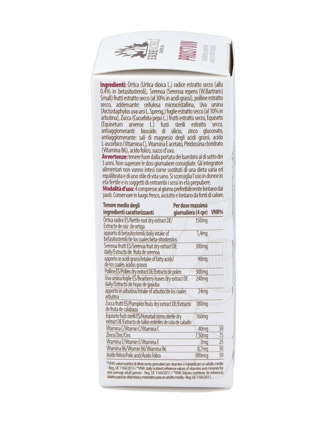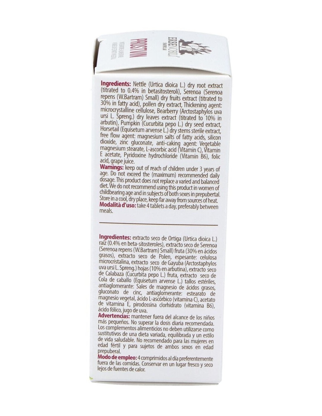 Extracto seco de raíz de ortiga (Urtica dioica L.) (0,4% de betasitosterol), Serenoa (Serenoa repens (W.Bartram) Small.) Extracto seco de frutas (30% de ácidos grasos), polen de extracto seco, espesante: celulosa microcristalina, gayuba (Arctostaphylos uva-ursi (L.) Spreng.) extracto seco de hojas (10% de arbutina), extracto seco de frutos de calabaza (Cucurbita pepo L.), extracto seco de tambores estériles de cola de caballo (Equisetum arvense L.) , antiaglomerante: dióxido de silicio, gluconato de zinc, antiaglomerante: sales de magnesio de ácidos grasos, ácido L-ascórbico (Vit. C), acetato de vitamina E, clorhidrato de pirodoxina (Vit. B6), ácido fólico, jugo de uva.