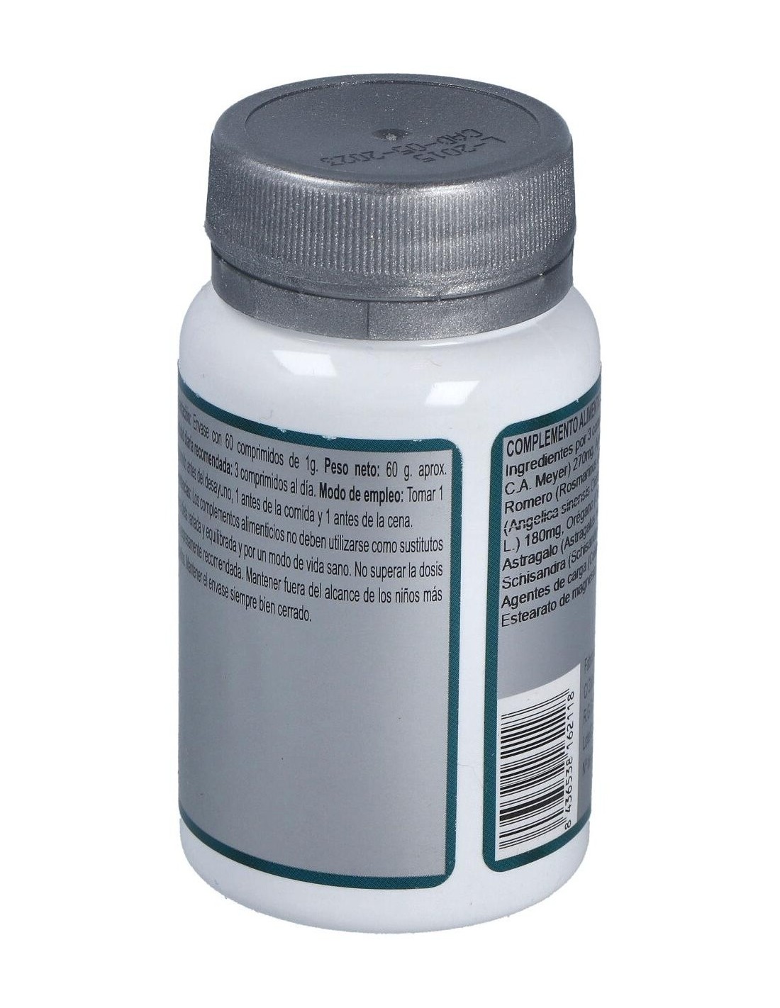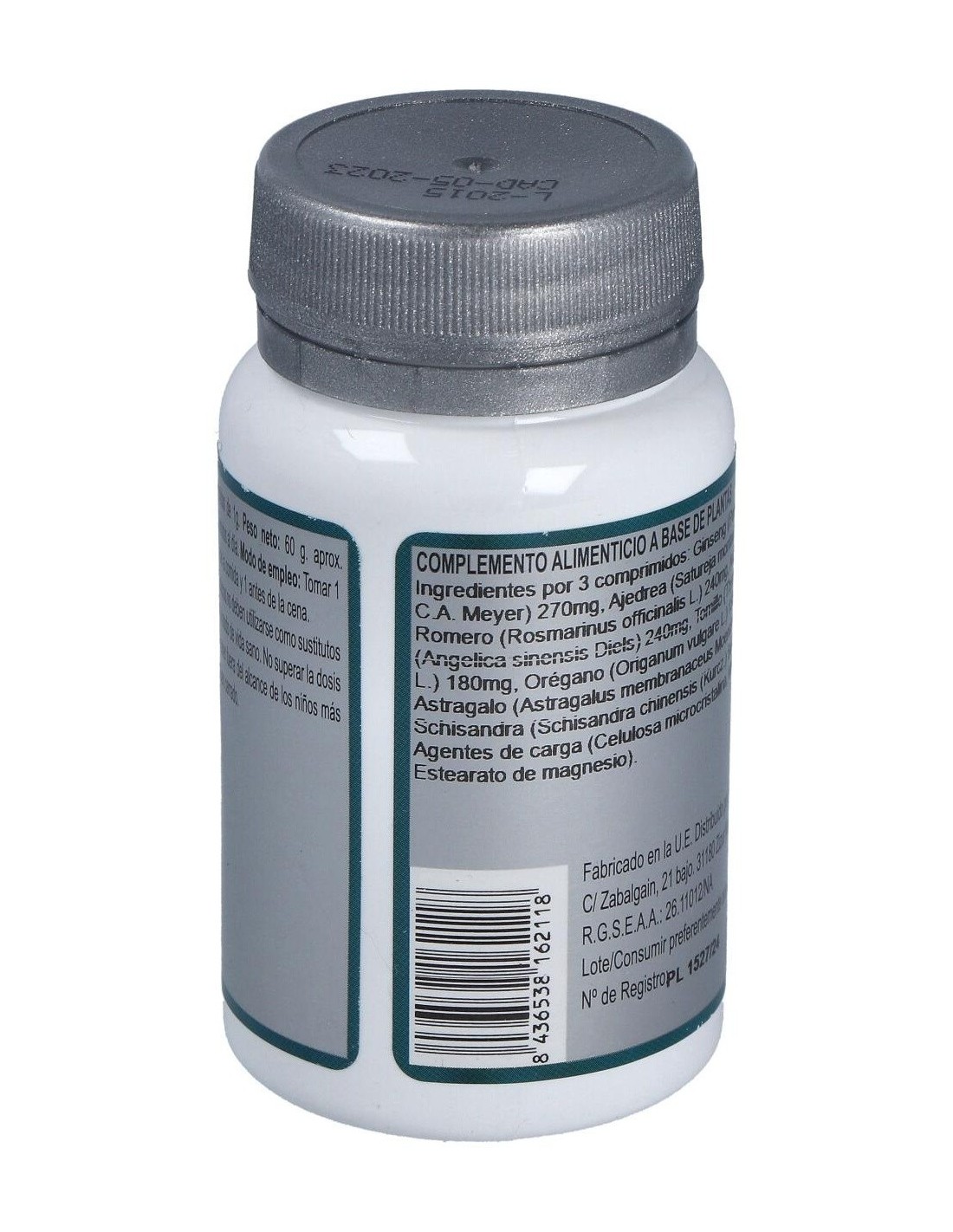 Ginseng (Panax ginseng C.A. Meyer), Ajedrea (Satureja montana L.), Romero (Rosmarinus officinalis L.), Angélica (Angelica sinensis Diels), Tomillo (Thymus vulgaris L.), Orégano (Origanum vulgare L.), Astrágalo (Astragalus membranaceus Moench), Schisandra (Schisandra chinensis (Kurcz.) Baill.).