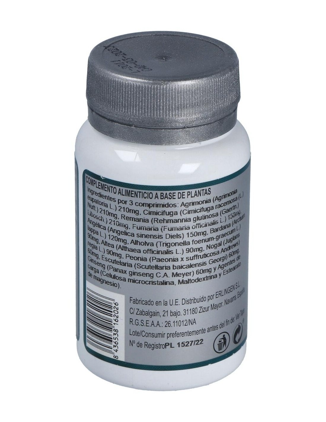 Agentes de carga (Celulosa microcristalina y Maltodextrina), Agrimonia (Agrimonia eupatoria L.) 270 mg, Remania (Rehmannia glutinosa (Gaertn.) DC.) 270 mg, Fumaria (Fumaria officinalis L.) 180 mg, Angélica (Angelica sinensis (Oliv.) Diels) 180 mg, Bardana (Arctium lappa L.) 120 mg, Alholva (Trigonella foenum-graecum L.) 90 mg, Altea (Althaea officinalis L.) 90 mg, Nogal (Juglans regia L.) 90 mg, Peonía (Paeonia suffruticosa Andrews) 60 mg, Escutelaria (Scutellaria baicalensis Georgi) 60 mg, Ginseng (Panax giseng C.A. Mey) 60 mg, Agente de carga (Estearato de magnesio) y Cimicifuga (Cimicifuga racemosa (L.) Nutt.) 30 mg