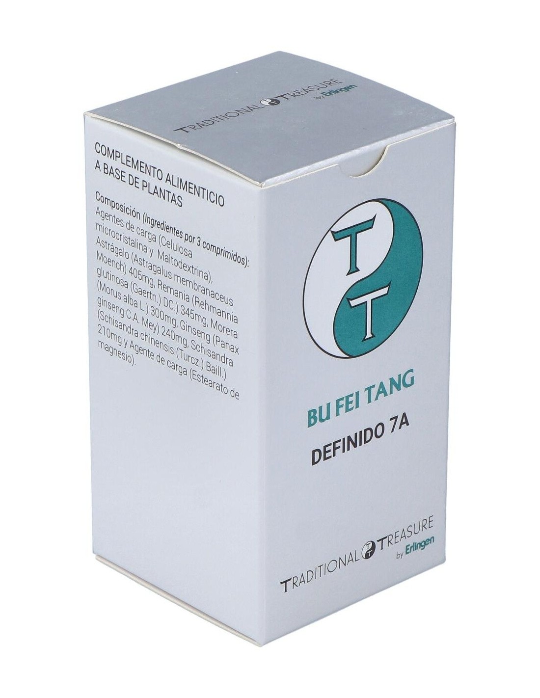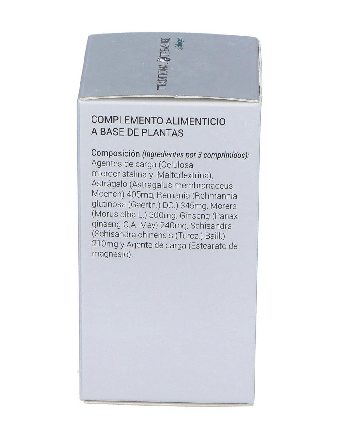 Agentes de carga (Celulosa microcristalina y Maltodextrina), Astrágalo (Astragalus membranaceus Moench) 405 mg, Remania (Rehmannia glutinosa (Gaertn.) DC.) 345 mg, Morera (Morus alba L.) 300 mg, Ginseng (Panax ginseng C.A. Mey) 240 mg, Schisandra (Schisandra chinensis (Turcz.) Baill.) 210 mg y Agente de carga (Estearato de magnesio).