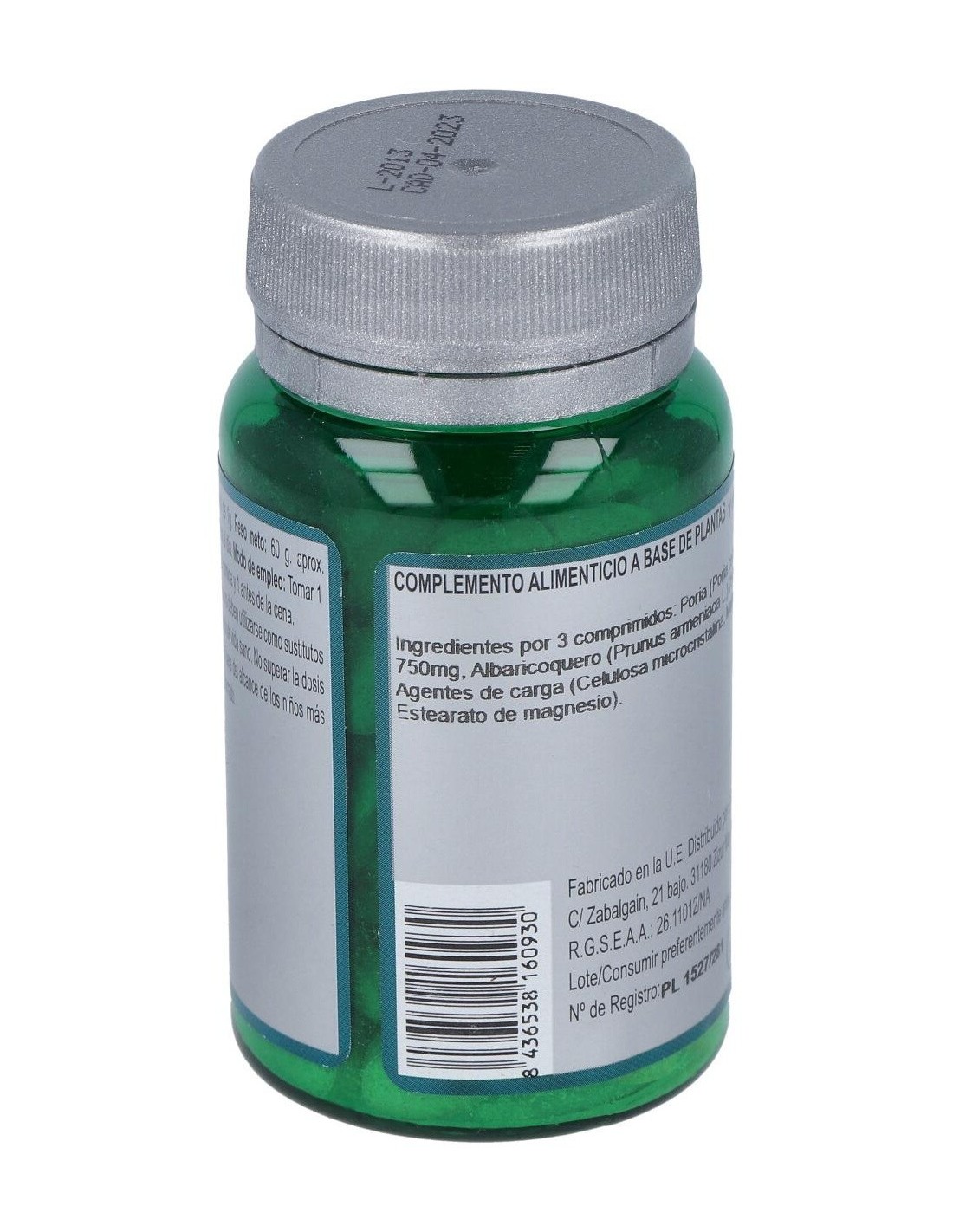 Poria (Poria cocos Wolf) 750 mg, Albaricoquero (Prunus armeniaca L.) 750 mg y Agentes de carga (Celulosa microcristalina, Maltodextrina y Estearato de magnesio).