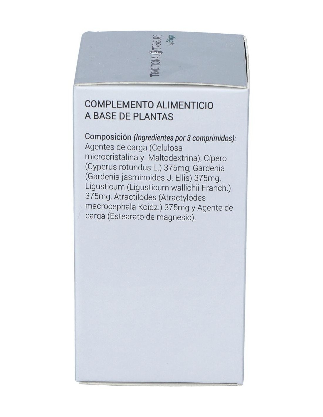 Agentes de carga (Celulosa microcristalina y Maltodextrina), Cípero (Cyperus rotundus L.) 375 mg, Gardenia (Gardenia jasminoides J. Ellis) 375 mg, Ligusticum (Ligusticum wallichii Franch.) 375 mg, Atractilodes (Atractylodes macrocephala Koidz.) 375 mg y Agente de carga (Estearato de magnesio).