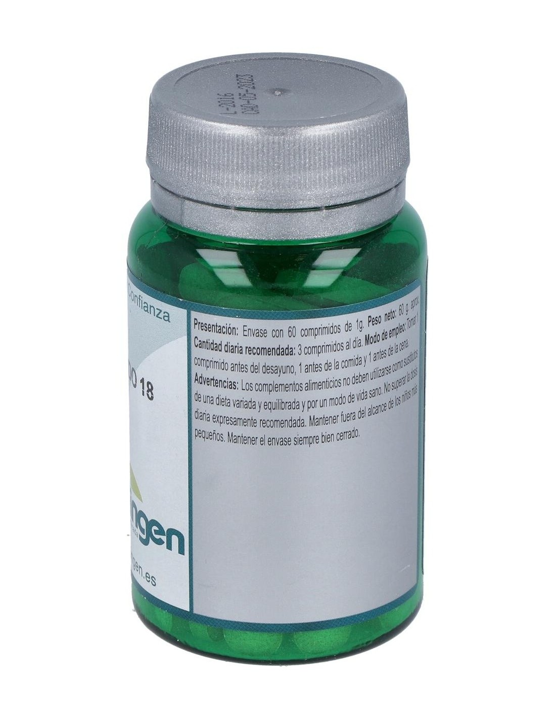 Agentes de carga (Celulosa microcristalina y Maltodextrina), Tomillo (Thymus vulgaris L.) 330 mg, Angélica (Angelica sinensis Diels) 270 mg, Peonía (Paeonia lactiflora Pall.) 255 mg, Menta (Mentha x piperita L.) 210 mg, Mejorana (Origanum majorana L.) 165 mg, Ajedrea (Satureja montana L.) 150 mg, Diente de león (Taraxacum officinale F.H. Wigg.) 120 mg y Agente de carga (Estearato de magnesio).