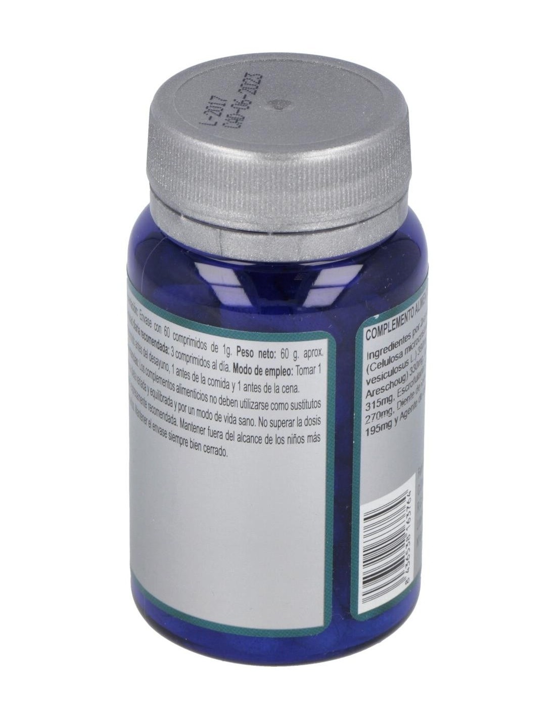 Agentes de carga (Celulosa microcristalina y Maltodextrina), Fucus (Fucus vesiculosus L.) 390 mg, Laminaria (Laminaria japonica J.E. Areschoug) 330 mg, Agrimonia (Agrimonia eupatoria L.) 315 mg, Escrofularia (Scrophularia ningpoensis Helmsl.) 270 mg, Diente de león (Taraxacum officinale F.H. Wigg.) 195 mg y Agente de carga (Estearato de magnesio).
