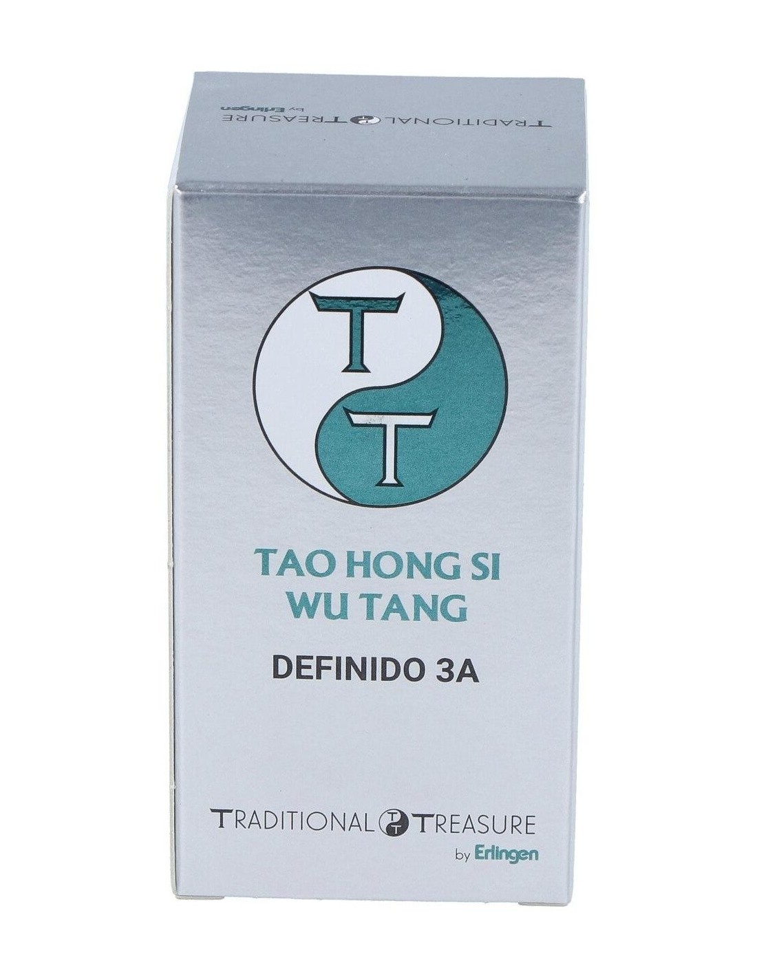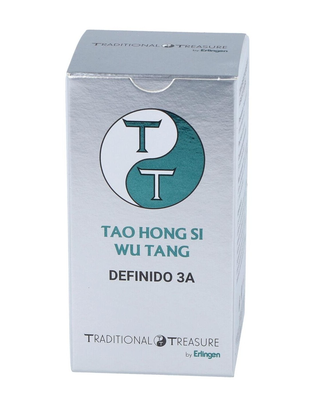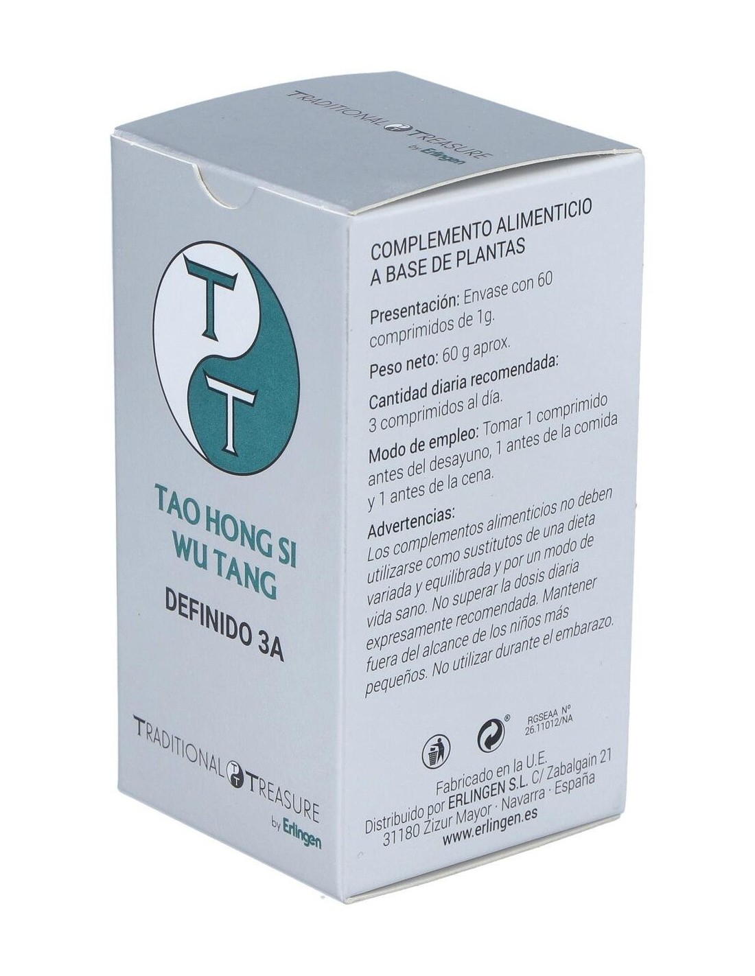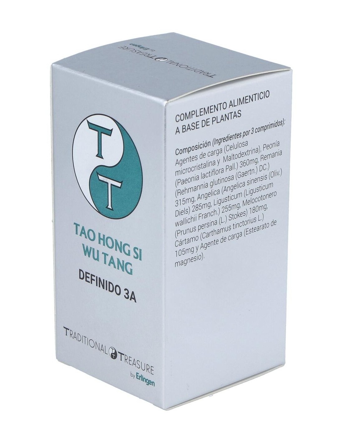 Agentes de carga (Celulosa microcristalina y Maltodextrina), Peonía (Paeonia lactiflora Pall.) 360 mg, Remania (Rehmannia glutinosa (Gaertn.) DC.) 315 mg, Angelica (Angelica sinensis (Oliv.) Diels) 285 mg, Ligusticum (Ligusticum wallichii Franch.) 255 mg, Melocotonero (Prunus persina (L.) Stokes) 180 mg, Cártamo (Carthamus tinctorius L.) 105 mg y Agente de carga (Estearato de magnesio).