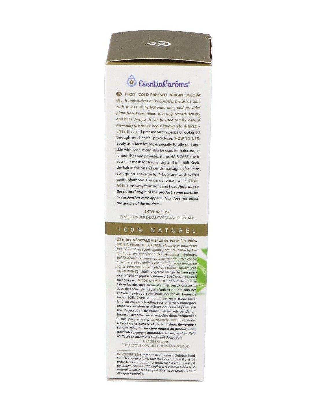 Es un aceite 100% natural de jojoba indicado para regular la hidratación, la regeneración celular y secreción sebácea en la piel. Con ceramidas vegetales es recomendado para la hidratación de pieles secas y grasas deshidratadas, cuidado del cuero cabelludo con hipersecreción sebácea y cabello seco. Puede utilizarse a modo de masaje en cuero cabelludo y mascarilla capilar. El aceite de semilla de jojoba es una cera líquida, biodegradable y no tóxica. Se obtiene mediante prensado en frío de sus semillas y tiene una composición total de 96% en ceramidas. Ayuda a hidratar como liberar la grasa de la piel, ayuda a disolver y desplazar el sebum que obstaculiza el folículo, dejándolo libre, proporcionan brillo y suavidad al cabello. Apto veganos, todo tipo de piel.