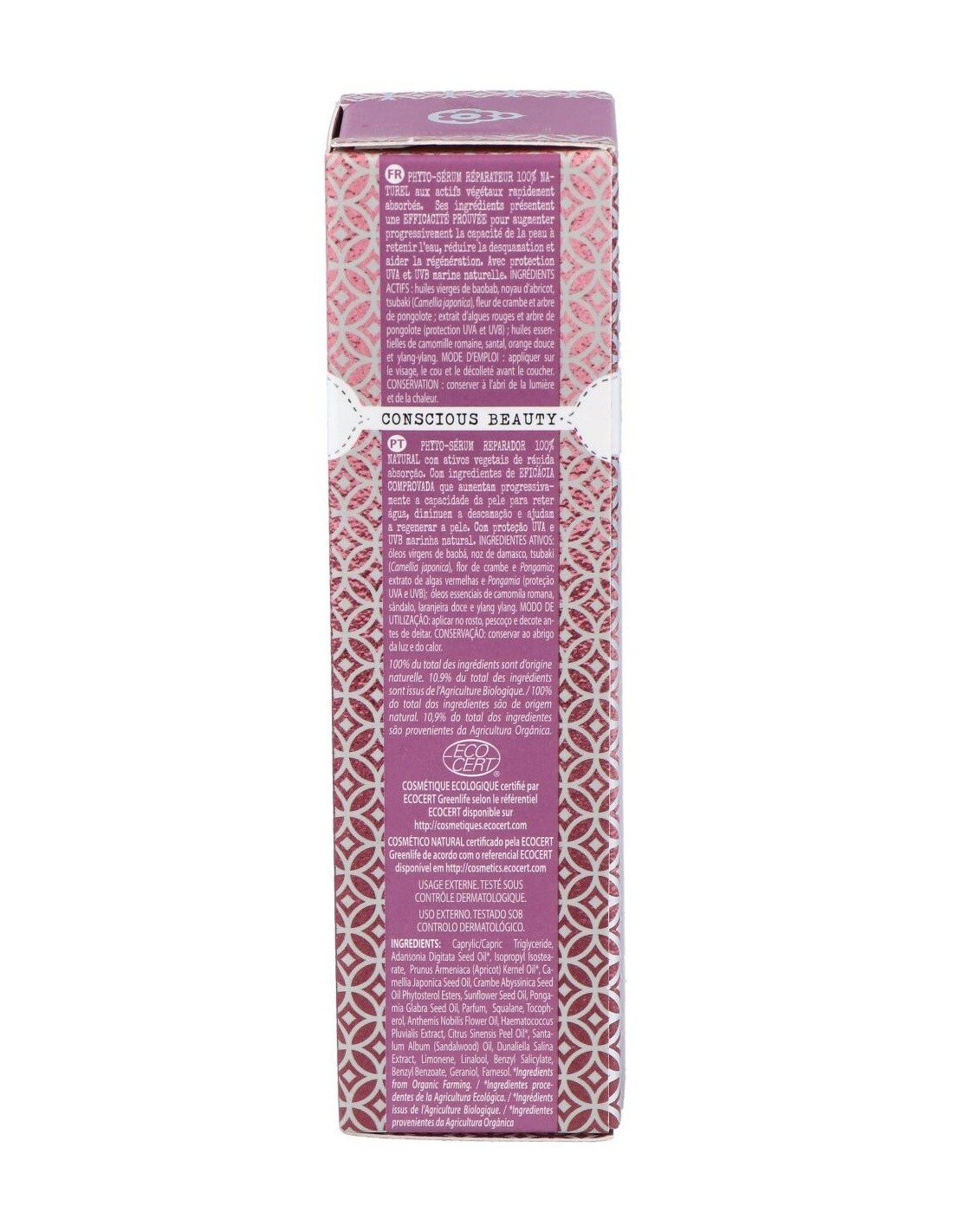 Aceites vírgenes de baobab, nuez de albaricoque, tsubaki (Camelia), flor de crambe y pongamia: extracto de algas rojas y pongamia (protección UVA Y UVB), aceites esenciales de manzanilla romana, sándalo, naranjo dulce e ylang-ylang.