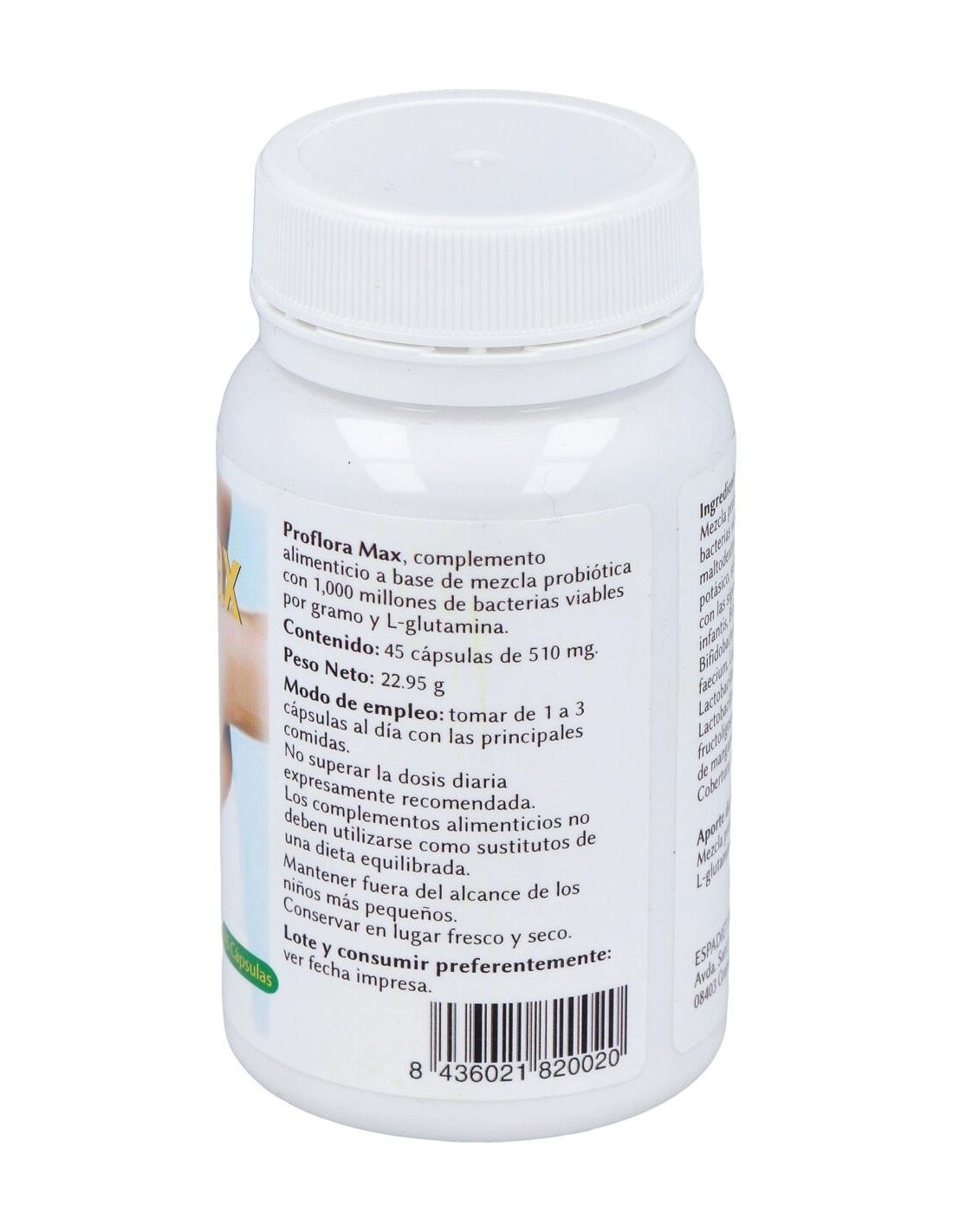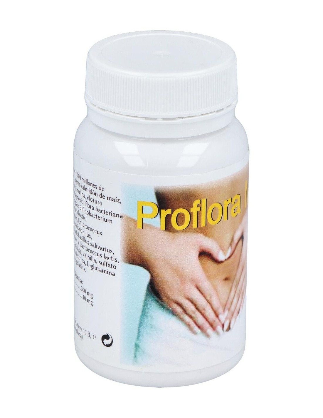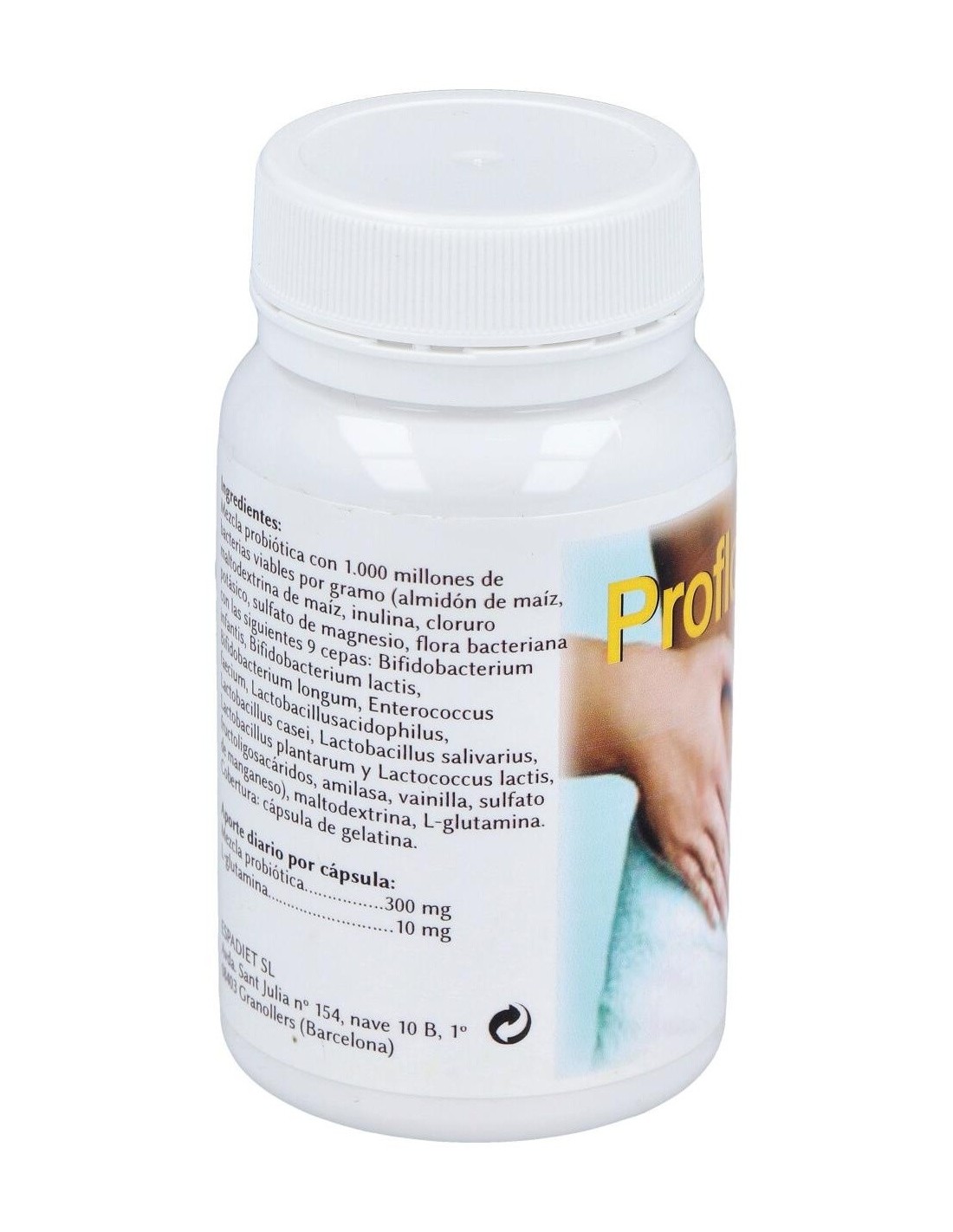 Mezcla probiótica con 1.000 millones de bacterias viables por gramo (almidón de maíz, maltodextrina de maíz, inulina, cloruro potásico, sulfato de magnesio, flora bacteriana con las siguientes 9 cepas: bifidobacterium infantis, bifidobacterium lactis, bifidobacterium longum, enterococcus faecium, lactobacillusacidophilus,lactobacillus casei, lactobacillus salivarius, lactobacillus plantarum y lactococcua lactis, fructoligosacáridos, amilasa, vainilla, sulfato de manganeso), maltodextrina, l-glutamina, cobertura: cápsula de gelatina blanca, colorante E-171.