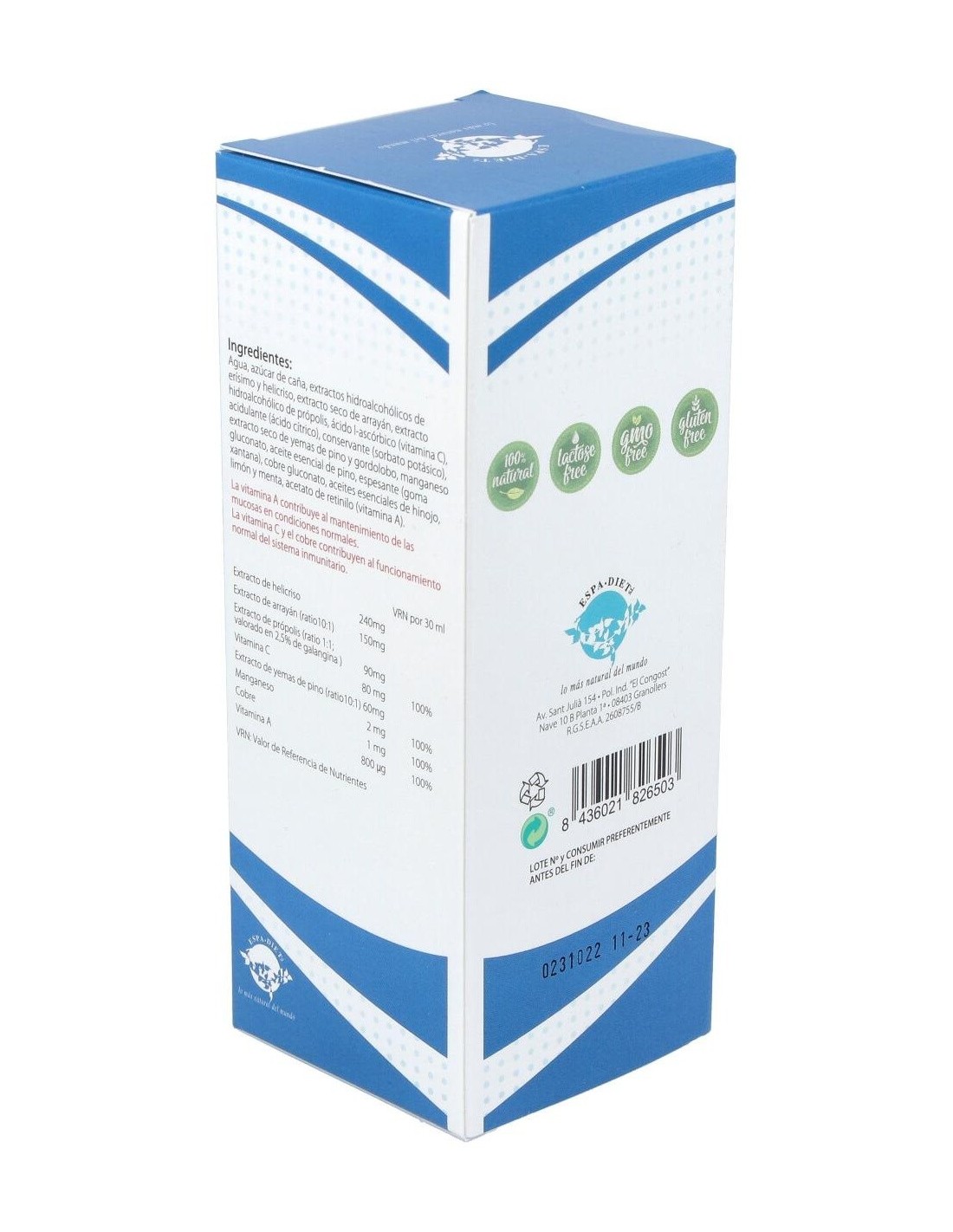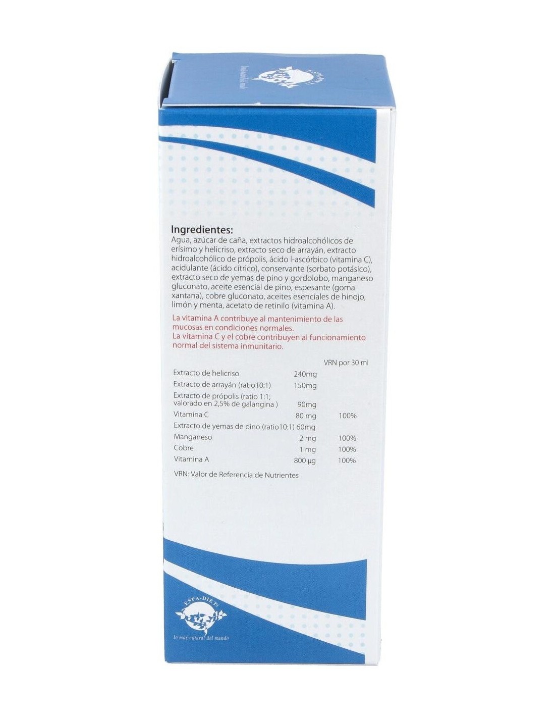 Complemento alimenticio en formato jarabe, diseñado para fortalecer las defensas naturales del cuerpo. Contiene helicriso, erísimo, yemas de pino, arrayán, extracto fluido de própolis, vitamina C, gordolobo, manganeso, cobre y vitamina A.. Favorece el buen funcionamiento del sistema cardiovascular y ayudan a mejorar las funciones cognitivas, concentración y memoria. Contiene vitaminas y minerales que estimulan las defensas del organismo. Apto para adultos y niños a partir de los 8 años de edad.