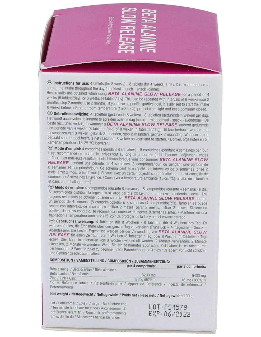 Beta-alanina - agentes de carga: hidroxipropilmetilcelulosa, celulosa antiaglomerantes: Dióxido de silicio, Estearato de magnesio Bisglicinato de Zinc