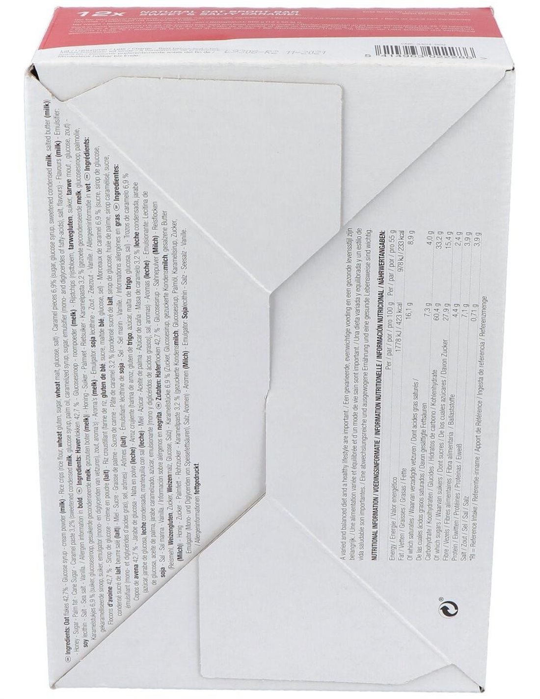 Copos de avena 42,7%, Jarabe de glucosa, polvo de crema (leche), Crips de arroz (harina de arroz, gluten de trigo, azúcar, malta de trigo, glucosa, sal), Trozos de caramelo 6,9% (azúcar, jarabe de glucosa, , Mantequilla salada (leche)), Miel, Azúcar, Grasa de palma , Azúcar de caña, Pasta de caramelo 3,2% (leche condensada azucarada, jarabe de glucosa, aceite de palma, jarabe caramelizado, azúcar, emulsionante (mono- y diglicéridos de ácidos grasos) ), Sabores) - Sabores (leche), Emulsionante: lecitina de soja, Sal, Sal marina, Vainilla.